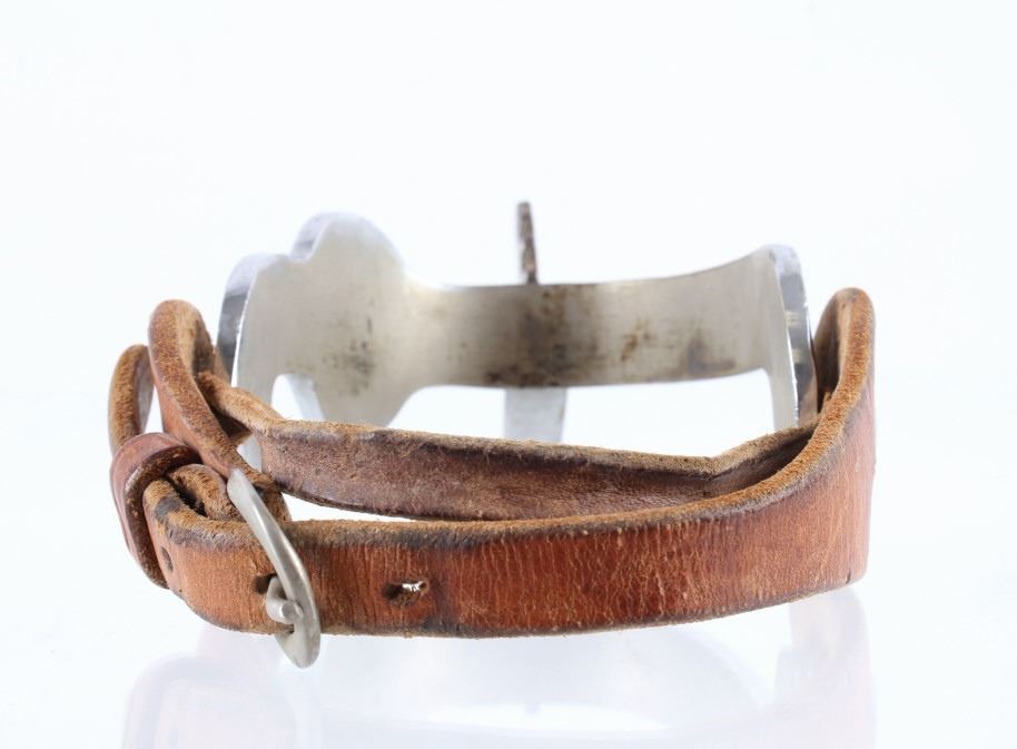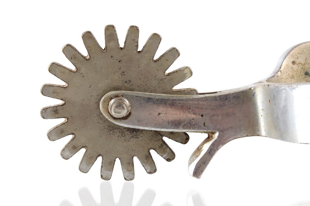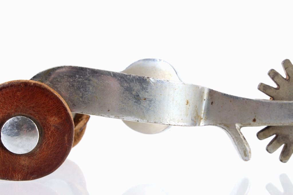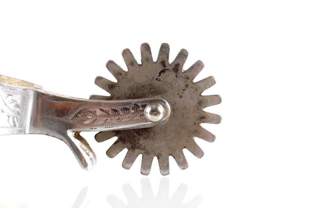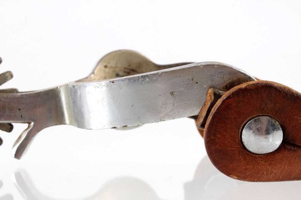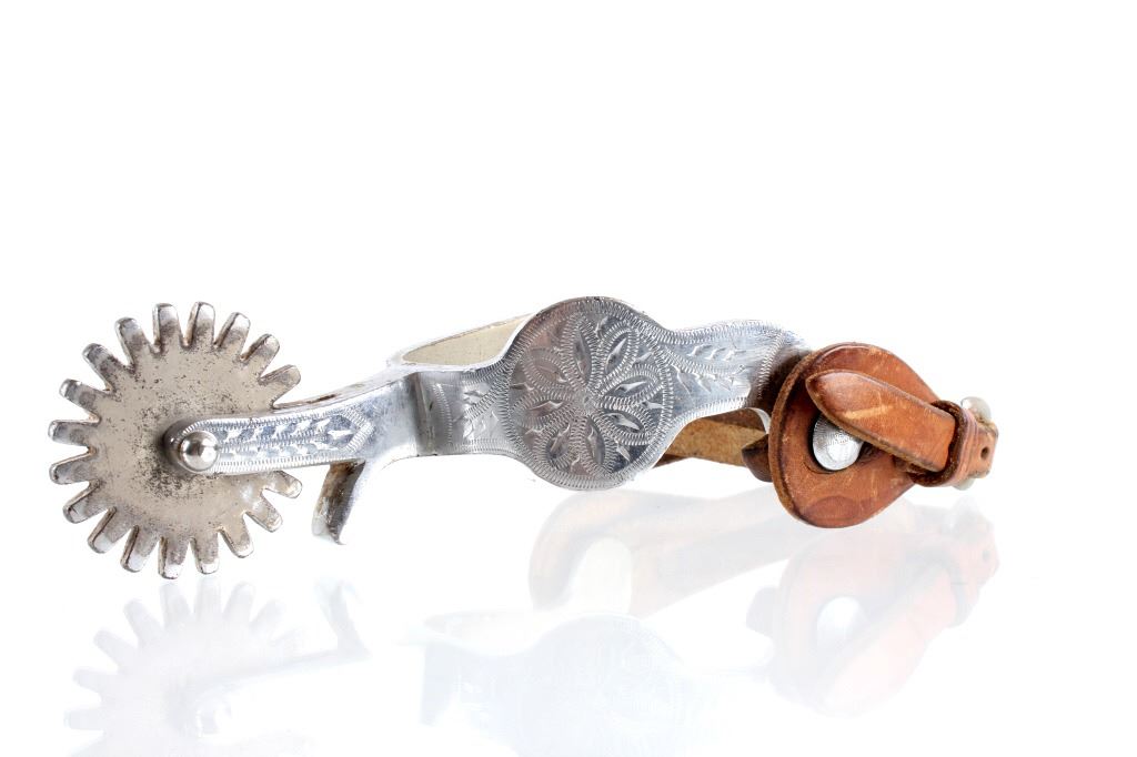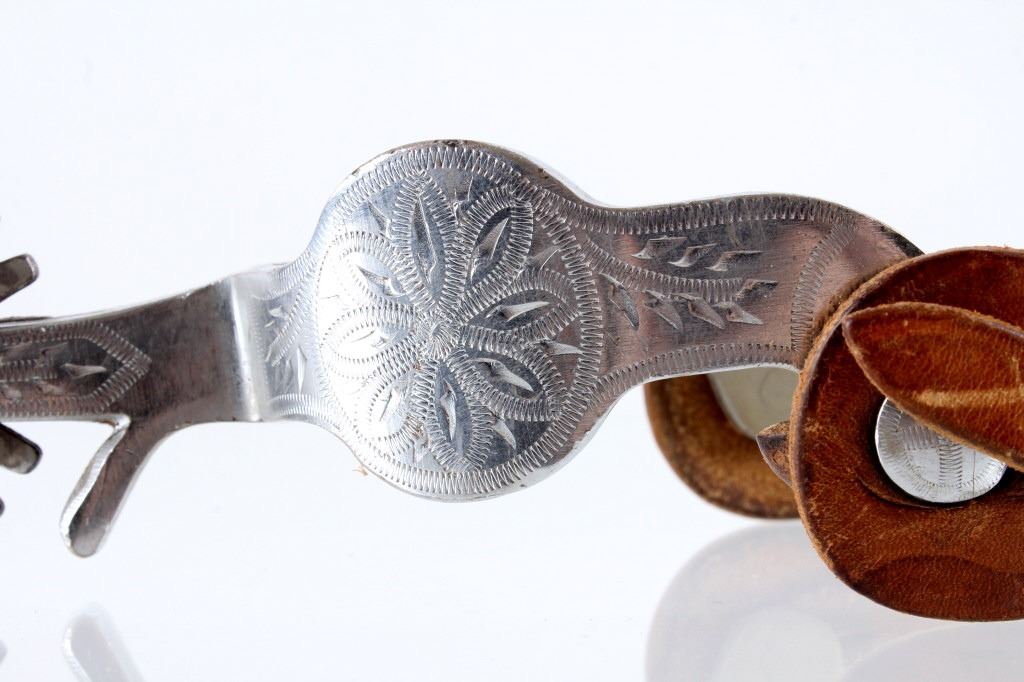 For your consideration is this pair of silver mounted large star rowel parade spurs shown from spur maker Crockett & Ranalde. These spurs are marked with the CR within a horseshoe at the heel of the band indicating Crockett & Renalde. The tooled silver mountings show floral design on each outer side of the spurs. Each spur has a double leather strap with buckle, and one strap shows an oval stamp reading "Champion Turp, Los Angeles, Cal.". These fine pair of spurs show in good condition for their age and use, with a nice patina to the metal, and rugged leather straps. The measurements of each spur is 9.25" from the spur strap to the rowel tip; and the overall measurements of each spur are approximately 6.5" x 3.5" x 9.25" with a 2.5" rowel.