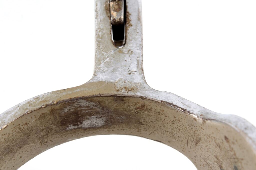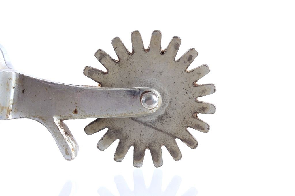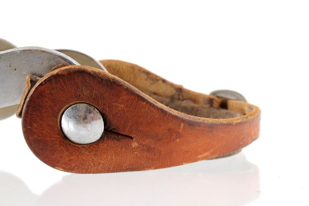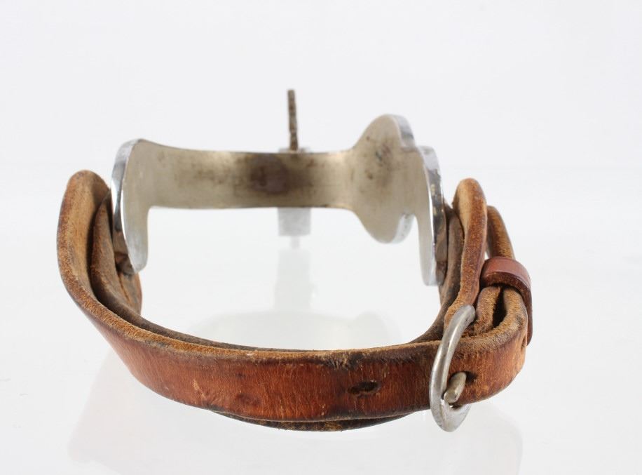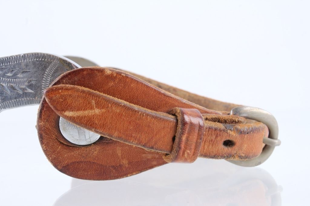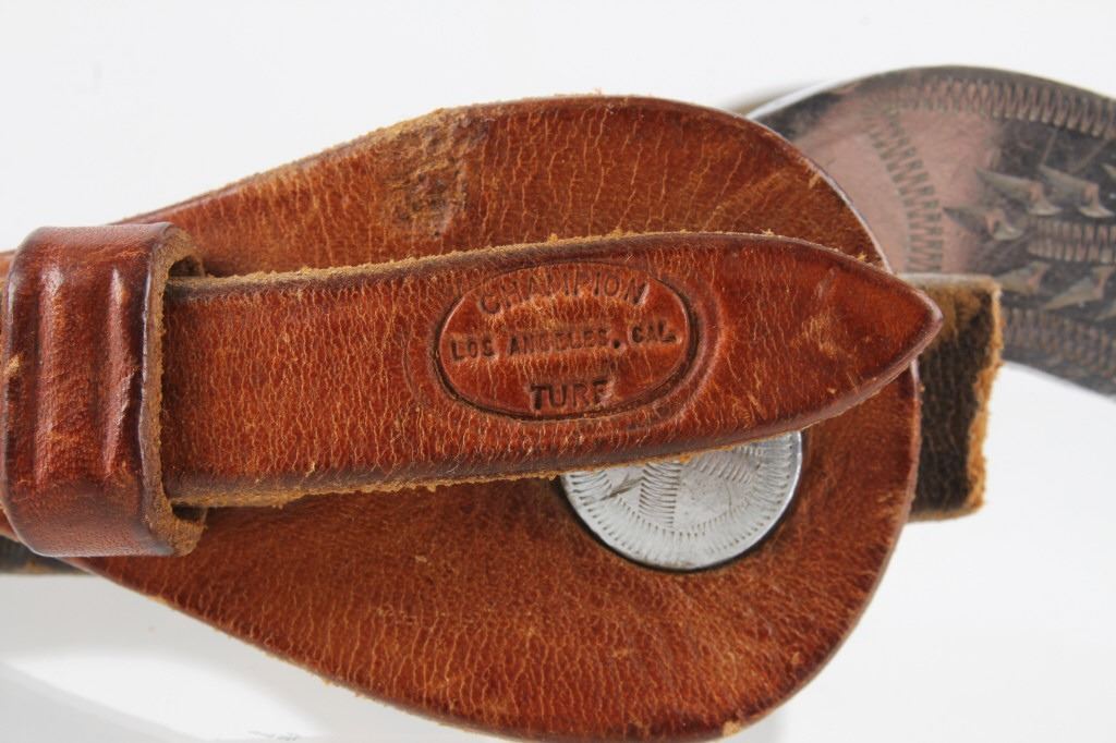 For your consideration is this pair of silver mounted large star rowel parade spurs shown from spur maker Crockett & Ranalde. These spurs are marked with the CR within a horseshoe at the heel of the band indicating Crockett & Renalde. The tooled silver mountings show floral design on each outer side of the spurs. Each spur has a double leather strap with buckle, and one strap shows an oval stamp reading "Champion Turp, Los Angeles, Cal.". These fine pair of spurs show in good condition for their age and use, with a nice patina to the metal, and rugged leather straps. The measurements of each spur is 9.25" from the spur strap to the rowel tip; and the overall measurements of each spur are approximately 6.5" x 3.5" x 9.25" with a 2.5" rowel.