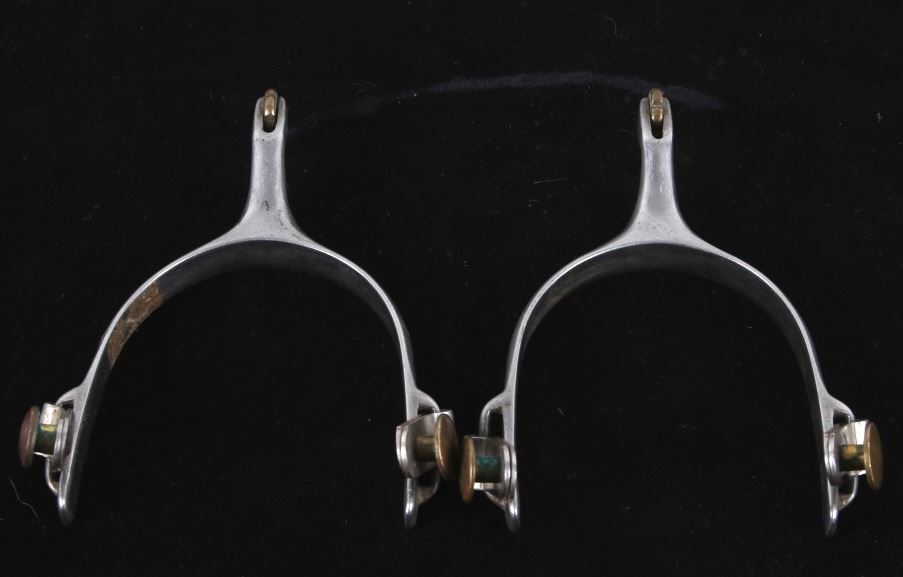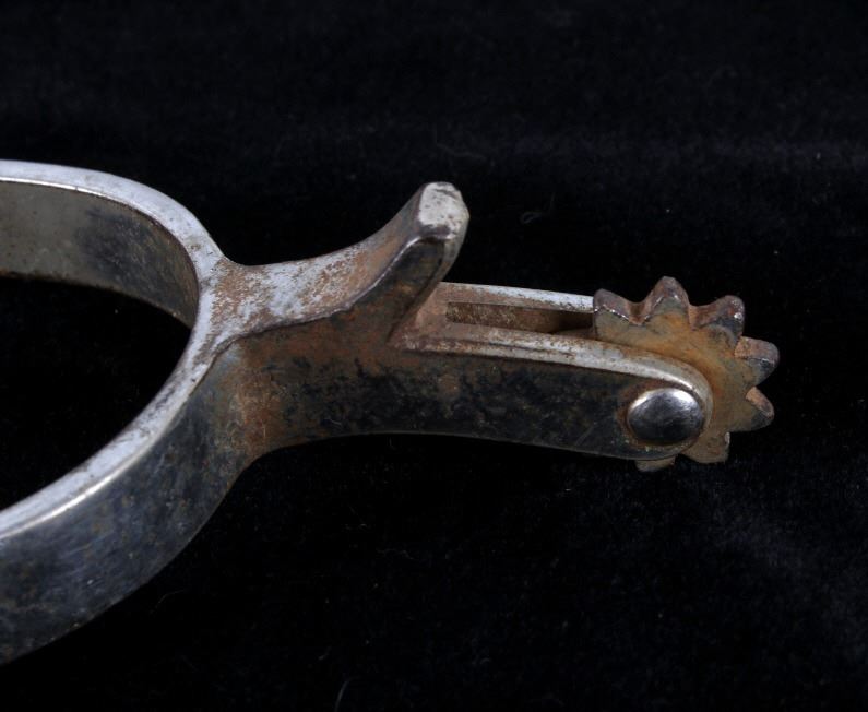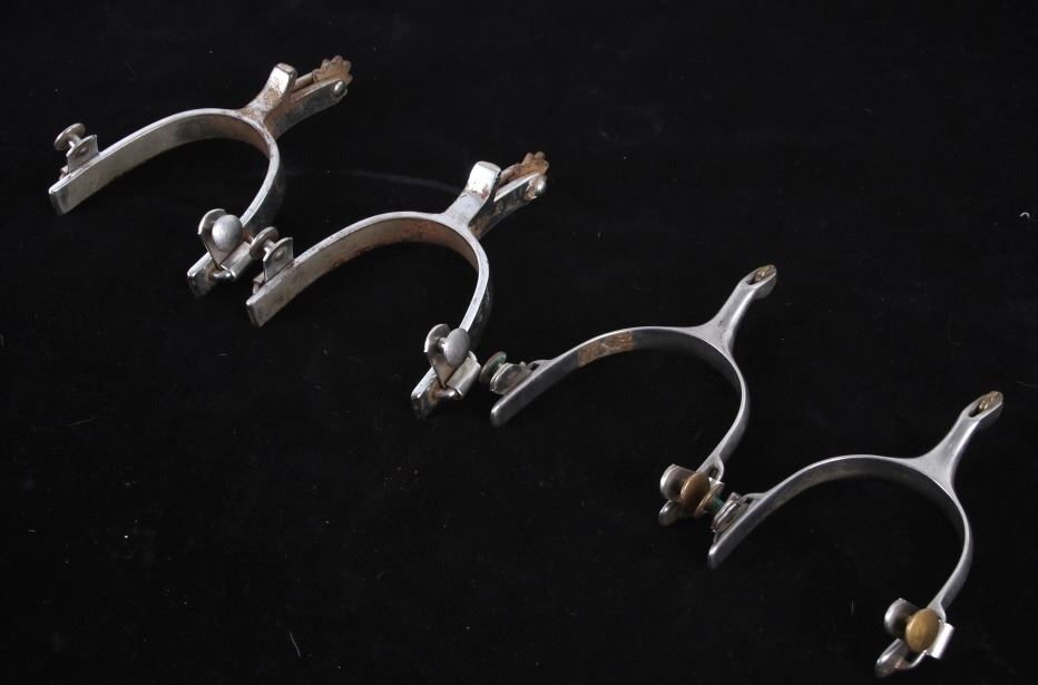 Featured in this lot is this collection of Crockett Renalde and Don Ricardo Spurs, circa 1940's. There are two pairs of spurs in this collection. The first pair is a pair of Crockett Renalde spurs, identified by the maker’s mark on the backs of the spur strap swivel buttons; the pair features ten tine star rowels and chap guards shown on drop shanks. The second pair is from Don Ricardo and is identified by the maker’s mark on the bottom of the neck of the spur shanks; the spurs have rowels of rounded clovers and show brass spur strap swivel buttons. The condition of this grouping of spurs is good and working, with oxidation and wear consistent with the age of these spurs. The measurements of these spurs are 1 1/2" x 4 1/4" x 5 1/2" and 1 1/2" x 4" x 5".