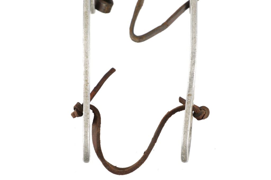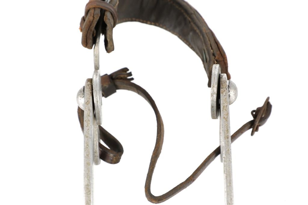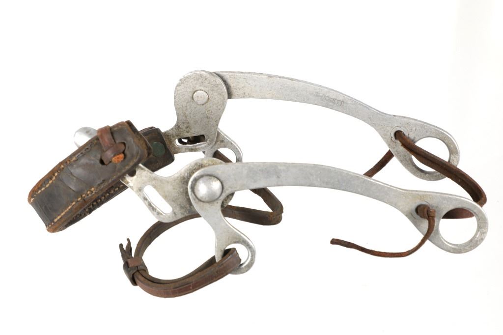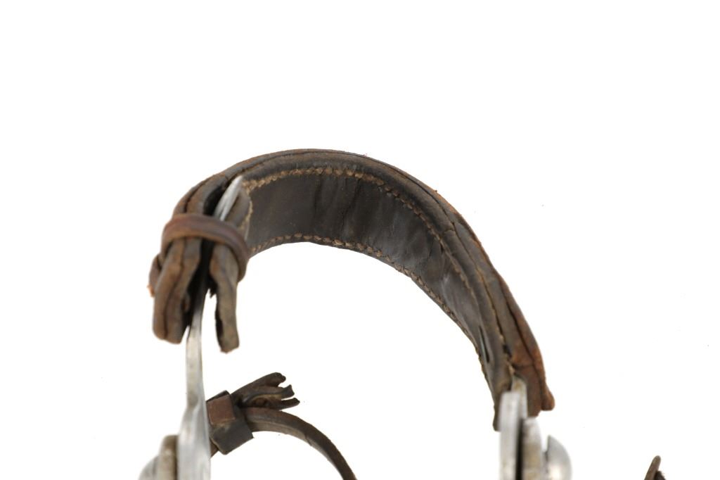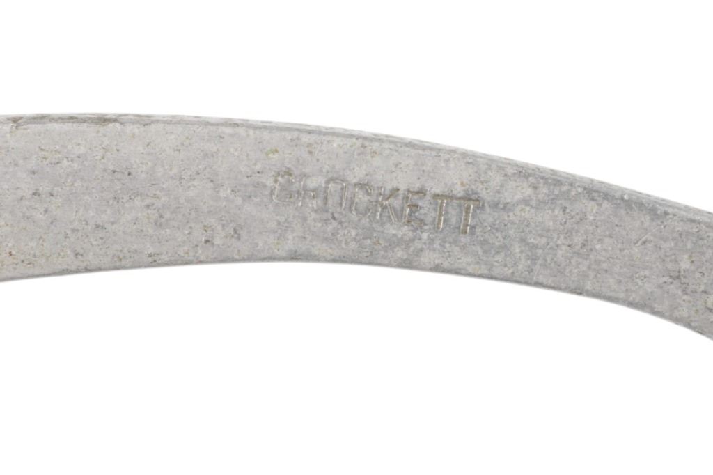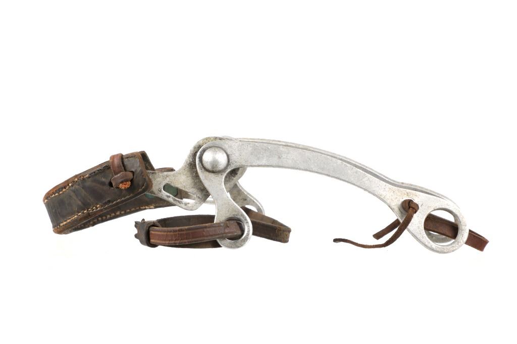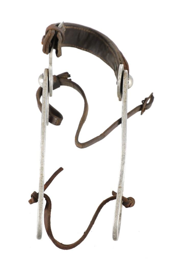 Featured in this lot is this Crockett Renalde mechanical hackamore circa 1950's. The mechanical hackamore features a wonderfully and professionally crafted aluminum and leather construction that shows a reliable design and a moving parts shank to nose piece. The mechanical hackamore is marked on the inside of the shanks as follows: CROCKETT. The condition of this Crockett hackamore is well preserved with a slight patina to the shanks of the hackamore and to the leather nose band consistent with age. The measurements of this of this hackamore is 13" x 5 3/4" x 6". The collective weight of this hackamore is 10oz.