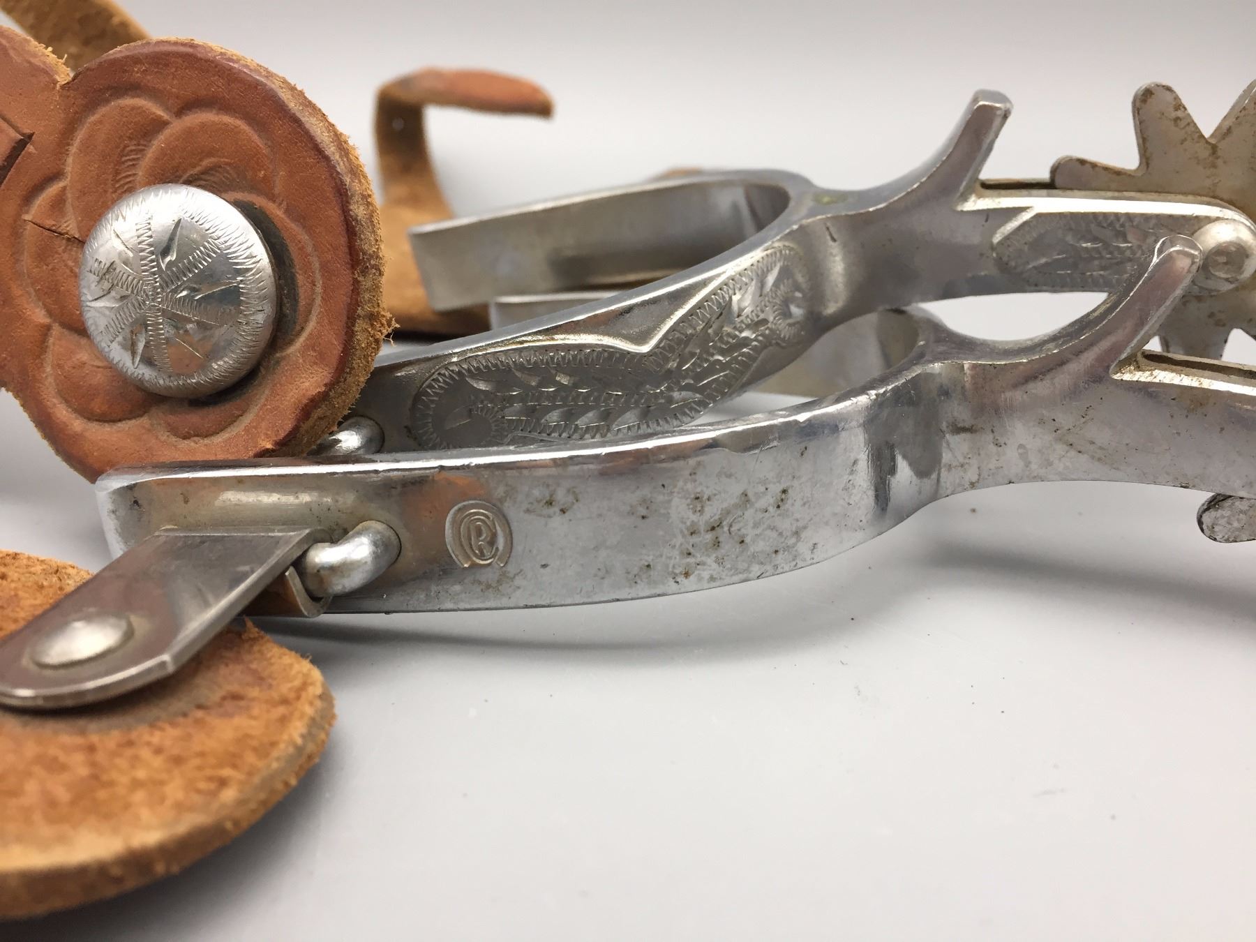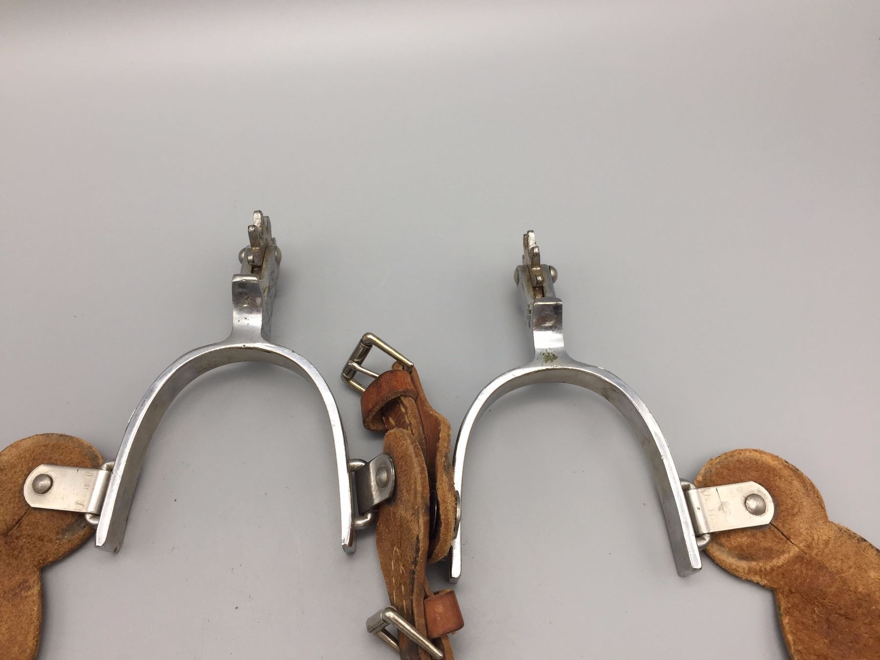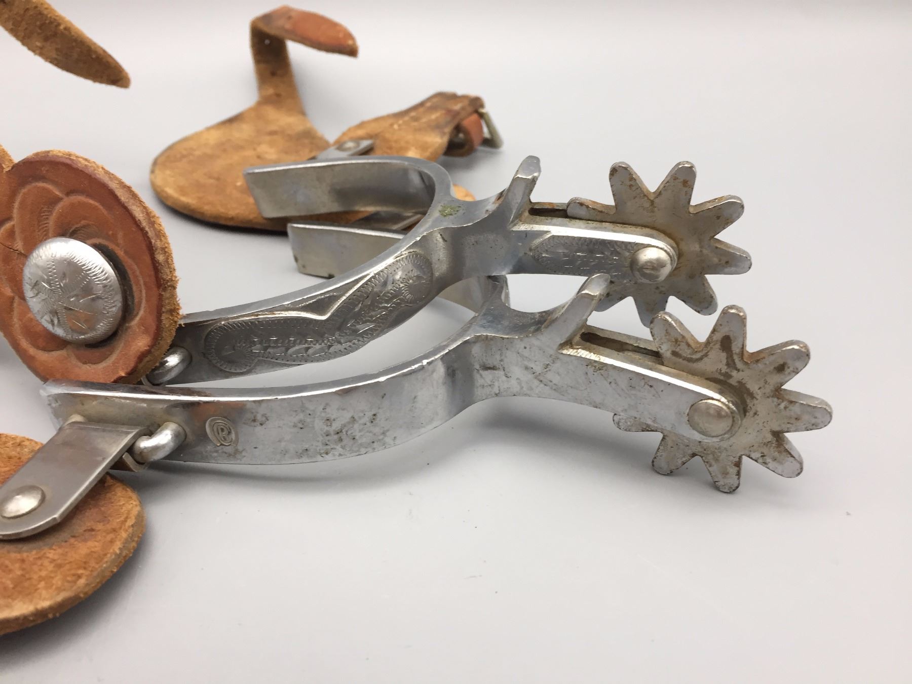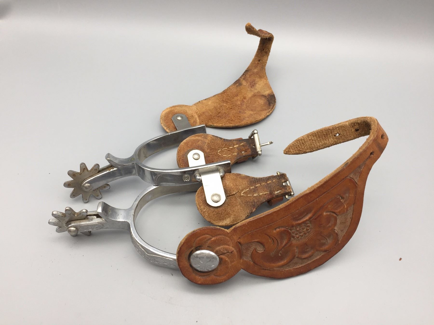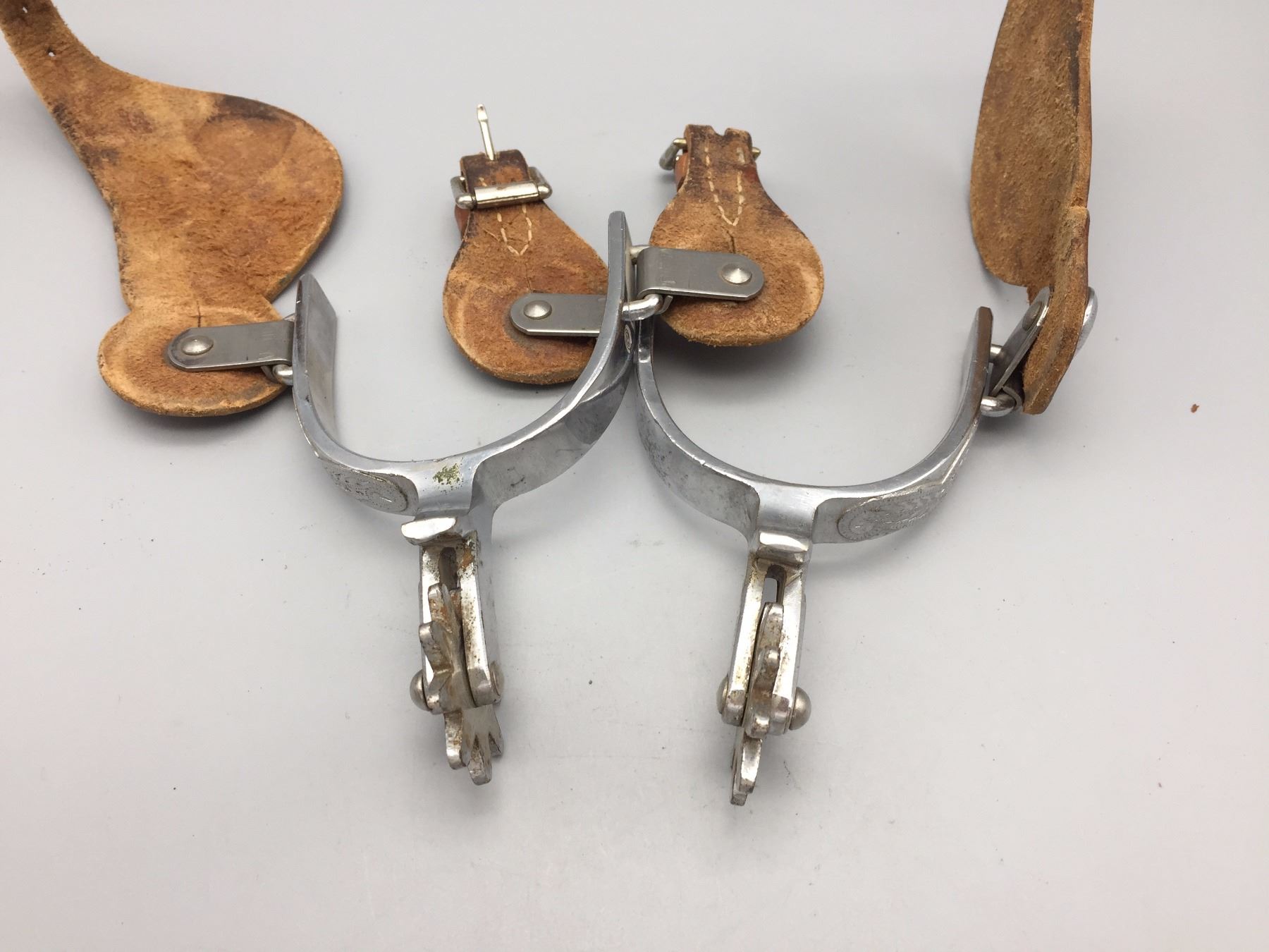 Description: Crockett Renalde Marked spurs with single mountings and spur leathers. Maker: Crockett Renalde. Approx. Age: 1960s or so. Size: Measures 3" opening- Band 5/8"- shank 2 1/2”. Condition: Pretty good for their age, normal wear expected. Please look closely at the pictures - they are an important part of our description. Shipping: There will be a $5 handling / packaging fee for shipping this lot. The actual cost of postage will be added on top of that.