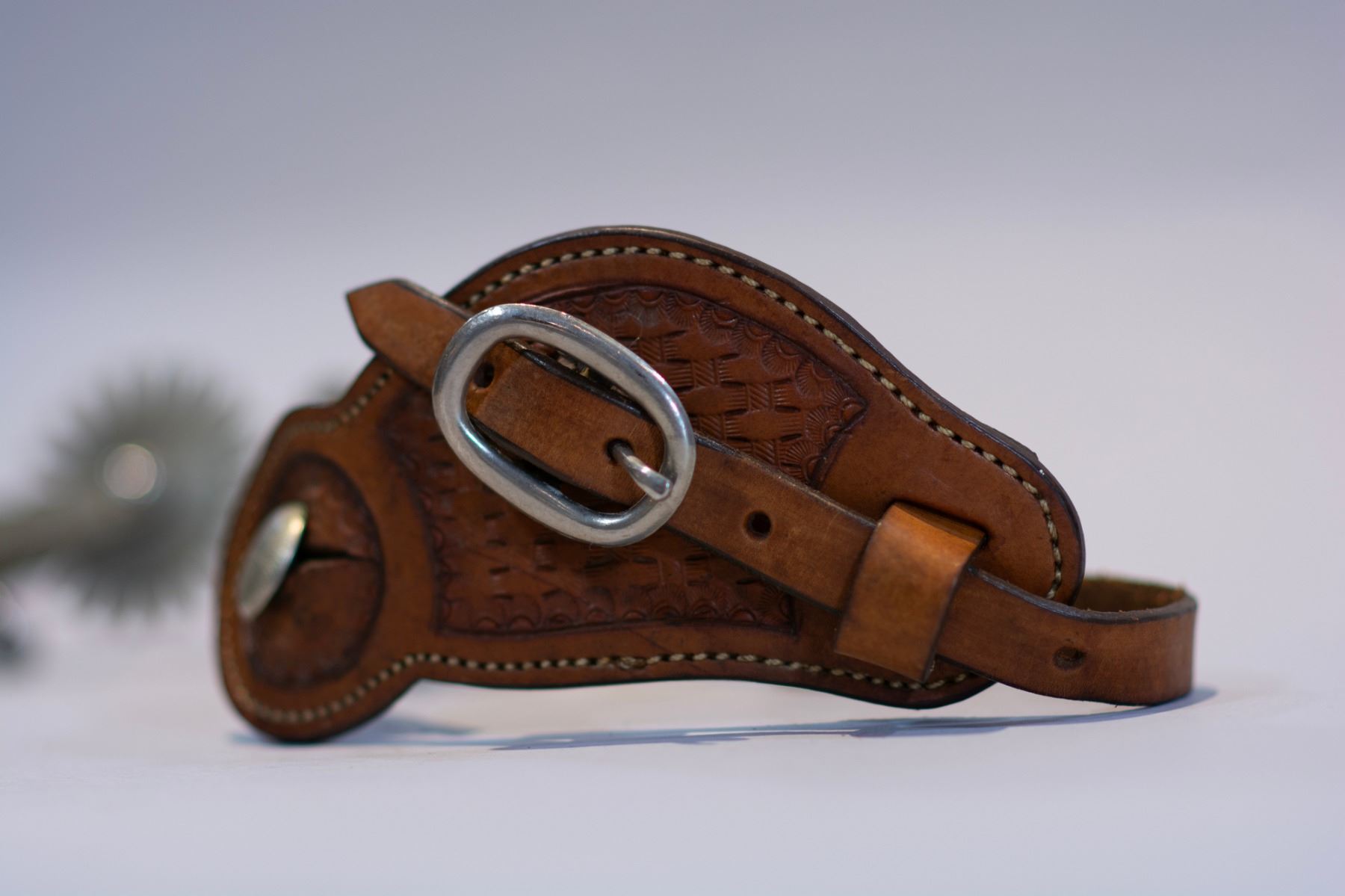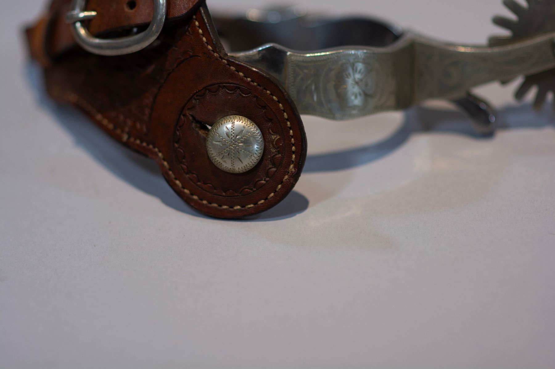 A pair of Crockett marked Renalde spurs. Spurs are single mounted with silver overlay, engraved in floral design on heel band and shank. Nice basket weave straps.