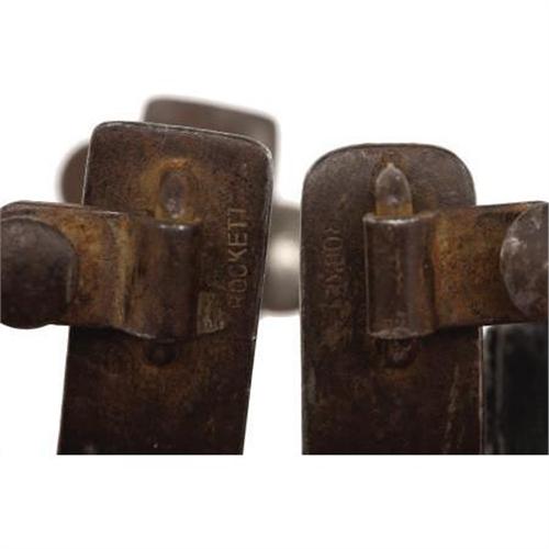 <B>Crockett Spurs Circa Early 20th Century.</B></I> Pair of crafted Crockett spurs, likely custom made as it marries two popular models. This pair is fashioned with the heel band of the "Texas Special" and the "No. 93" shank. Because spurs were made to order, it was not uncommon for a customer to request combining favored features from different models. One and a half inch rowels, with five rounded points. "Crockett" hallmark appears on plain side of each heel band.<BR><BR><b>Shipping:</b> Miscellaneous Collectibles, Smal (<a target="_blank" href="http://www.heritageauctions.com/common/shipping.php">view shipping information</a>)