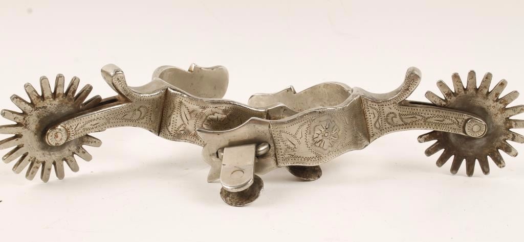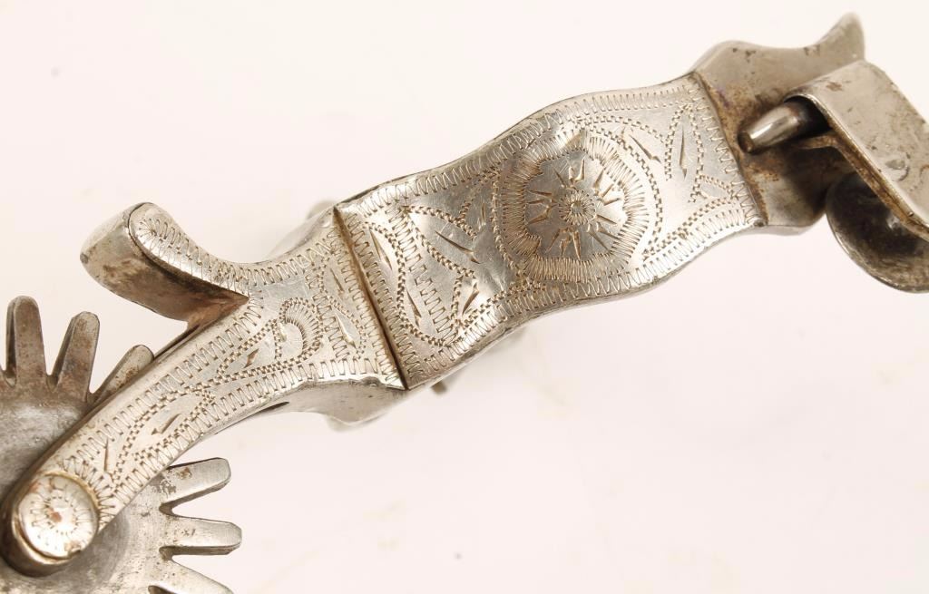 Nickel Spurs with engraved floral engraved design, marked Crockett.