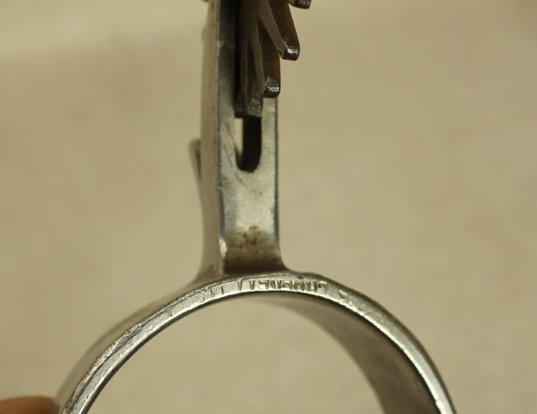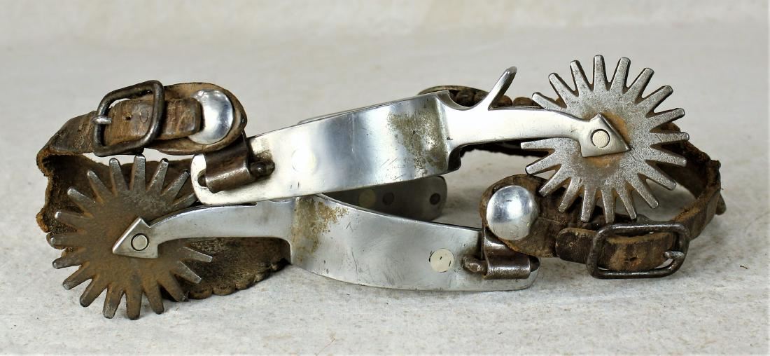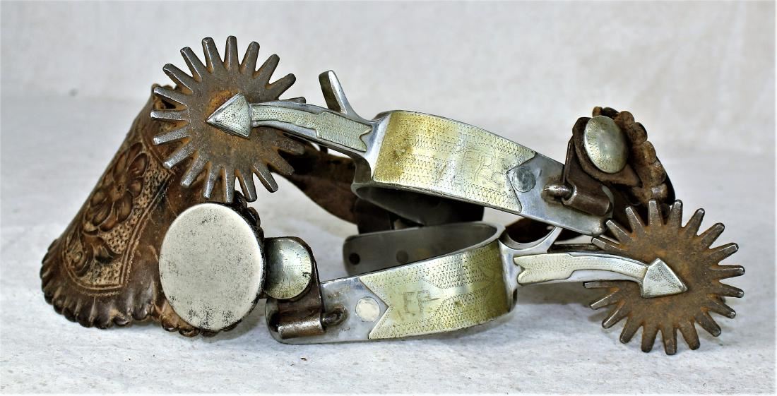 Interesting unmarked Crockett arrow shank spurs single mounted with large banners, tapered heelbands and large rowels, completed with original straps. Showing some interesting cowboy repair.