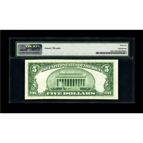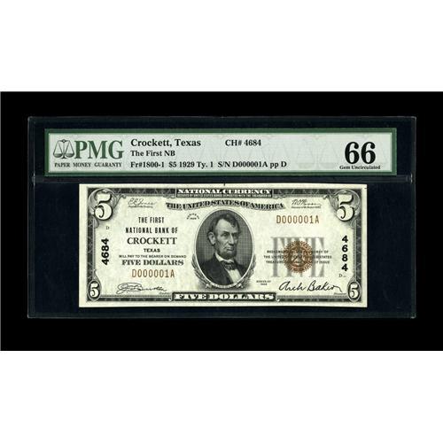 <B>Crockett, TX</B></I> - $5 1929 Ty. 1 <B>The First NB</B></I> Ch. # 4684<BR>Always a popular bank name because of its reference to the legendary Davy Crockett and a scarce issue as well, one of just eleven small size notes reported. Well margined as great care was taken during the cutting process. Graded <B>Gem Uncirculated 66</B></I> by PMG.<BR><BR><b>Shipping:</b> Coin/Currency (<a target="_blank" href="http://www.heritageauctions.com/common/shipping.php">view shipping information</a>)