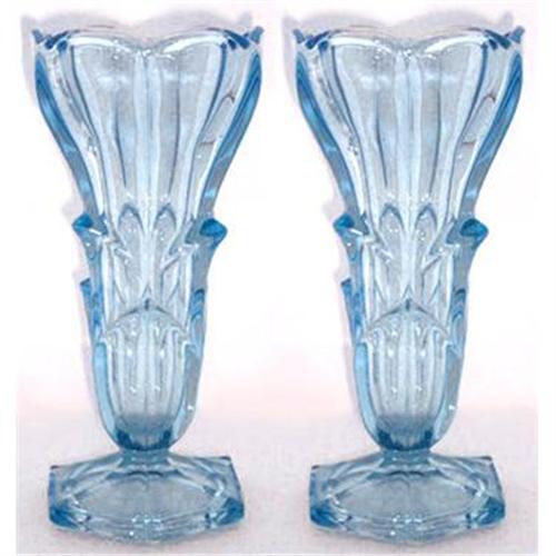 This pair of blue Elegant Depression Glass vases was produced, in England circa 1930-1940s. Six elegantly proportioned petals form Crocus Blossoms that measure 8" tall x 3 3/4" across and sit on a hexagonal base. Both vases are in excellent condition.