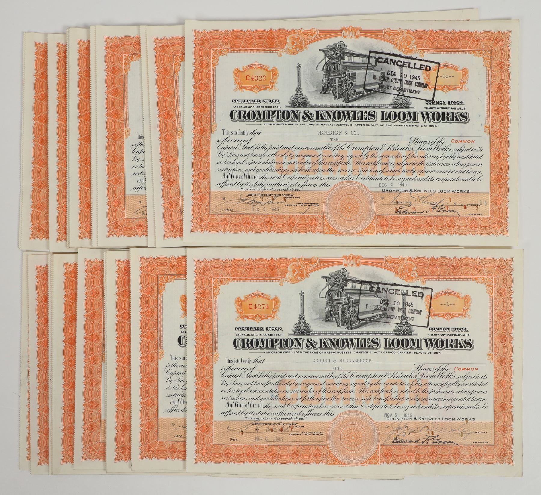 Crompton & Knowles Loom Works Stocks - Dealer Group. About 26 certificates, mostly issued and cancelled with revenue stamps on reverse. 1945. Crompton & Knowles Loom Works was established in 1900 by the merger of two loom-manufacturing companies. The company designed and built looms for the textile industry until the 1980s. See: worcesterhistorical.com for more information and history on this interesting, important company.