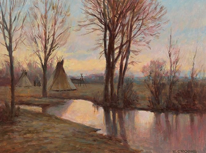 Ron Crooks painted in what we would now call a nostalgic Western style, one you might see in an old copy of Western Story magazine. His rich landscapes surround the central idea in his work.