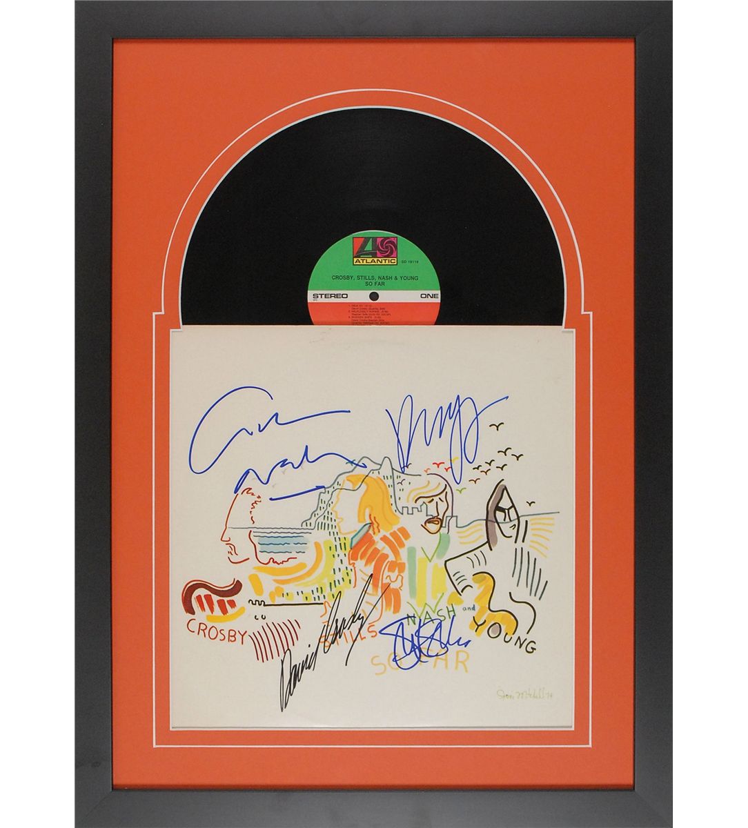 So Far album signed in blue and black felt tip by David Crosby, Stephen Stills, Graham Nash, and Neil Young. Expertly matted and framed with the record showing to an overall size of 18 x 25. In fine condition. The record is included. Accompanied by a full letter of authenticity from Roger Epperson/REAL. Oversized.
