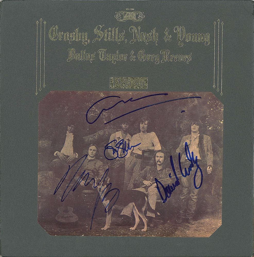 Deja Vu album signed on the front cover in blue felt tip by Stephen Stills, David Crosby, Neil Young, and Graham Nash. In fine condition. The record is not included. Consignor notes that the Crosby, Stills, and Nash signatures were obtained on June 16, 1996, in Buffalo, New York, and the Young signature on March 10, 2004, at the Ritz-Carlton in Cleveland, Ohio. Accompanied by a photo taken at the time of the Stills signing.