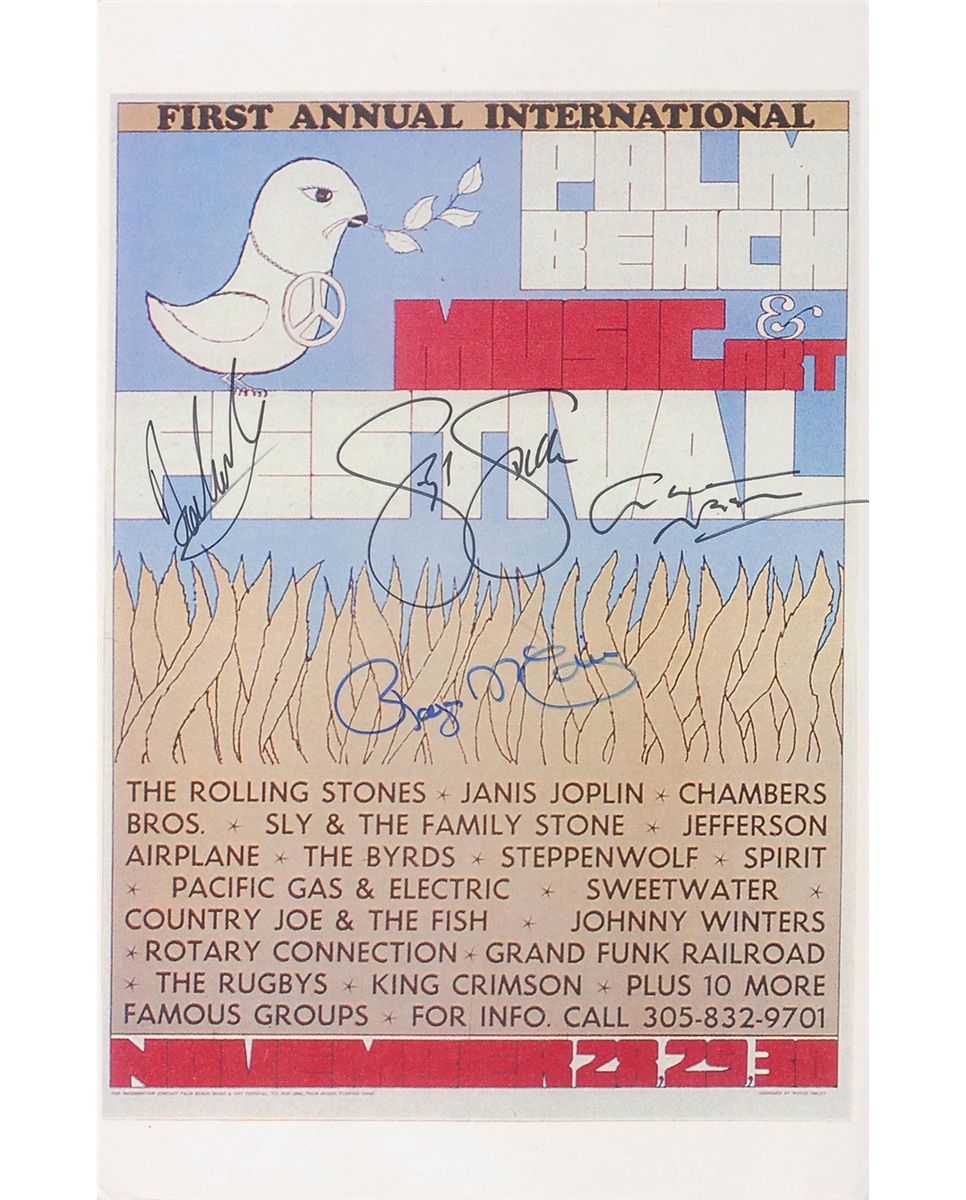 Color 11 x 17 print of a poster for the First Annual International Music & Art Festival, signed in black felt tip by David Crosby, Stephen Stills, and Graham Nash, and signed in blue felt tip by Roger McGuinn. In fine condition.