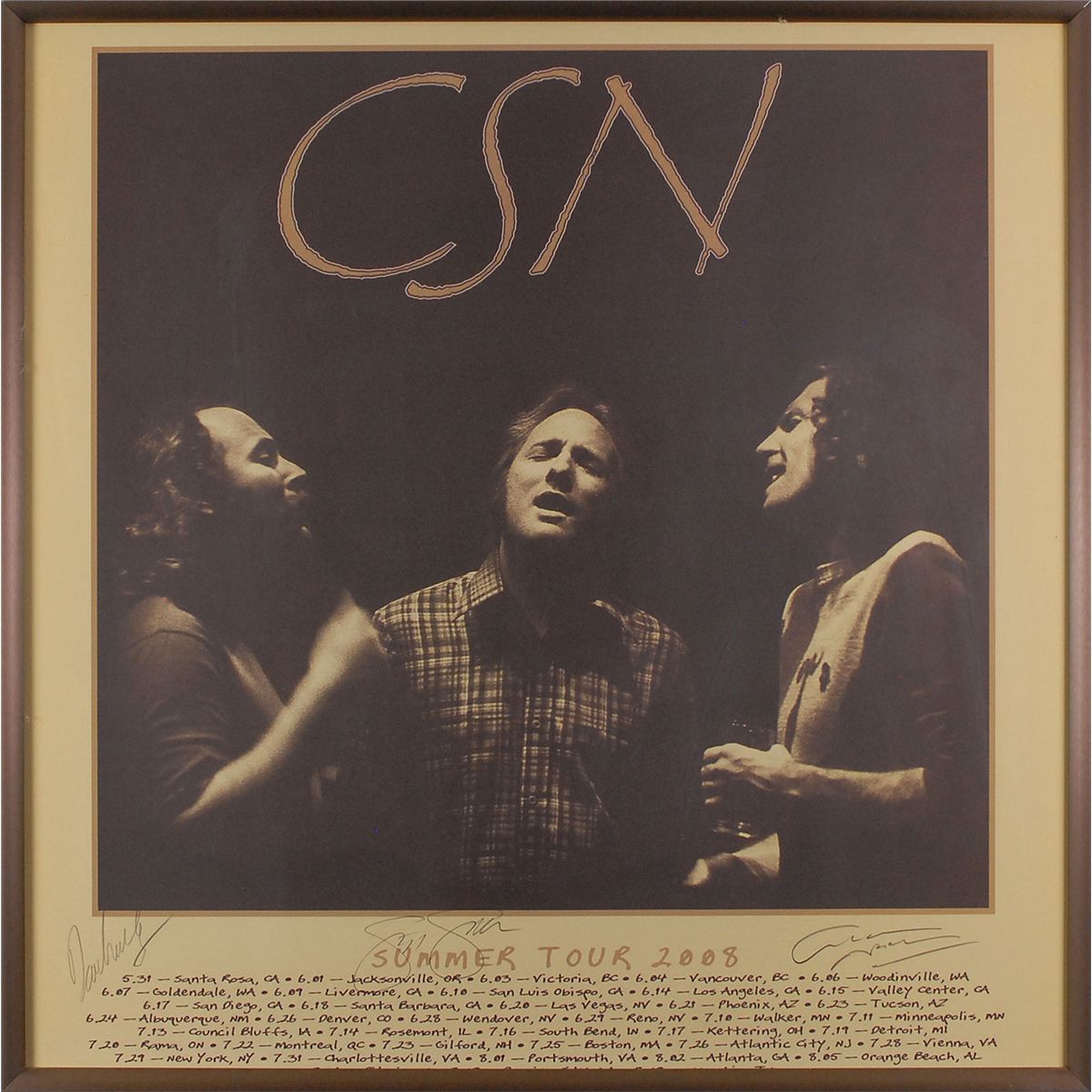 Color 24 x 24 print for the dates of their 2008 summer tour, signed in pencil by David Crosby, Stephen Stills, and Graham Nash. Framed to an overall size of 25.25 x 25.25. In very fine condition. Oversized.