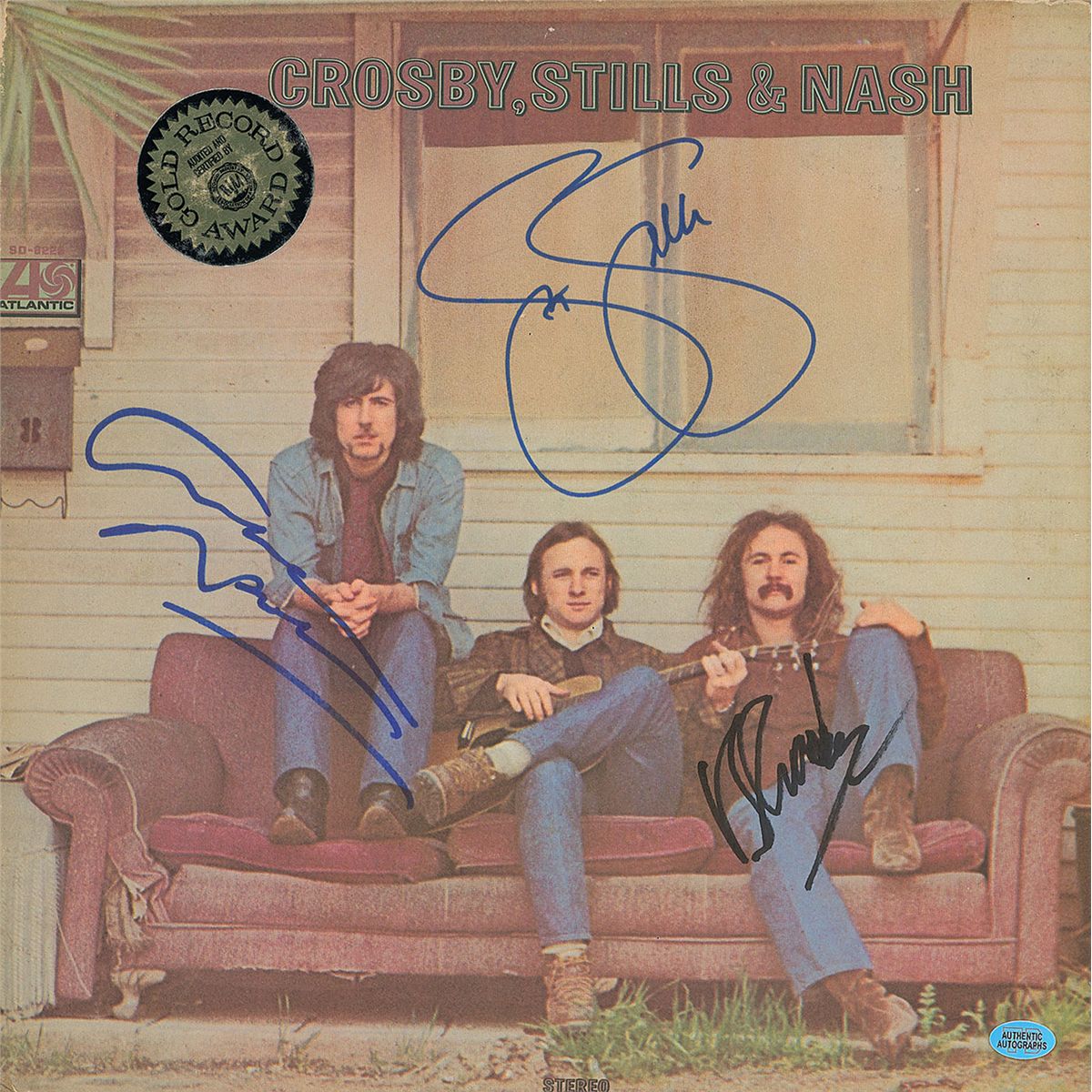Self-titled album signed on the front cover in blue and black felt tip by David Crosby, Stephen Stills, and Graham Nash. Wear and splitting to edges, otherwise fine condition. The record is included.