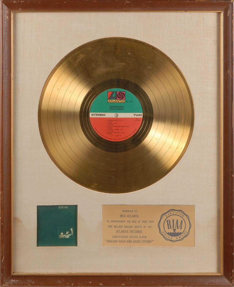 Official white-matte RIAA platinum sales award presented “to commemorate the sale of more than one million dollars worth of the Atlantic Records long-playing record album ‘Graham Nash and David Crosby.’” Framed with its disc, plate, and a small image of the album cover to an overall size of 17.75 x 21.5. Award retains its original backing. In fine condition.
