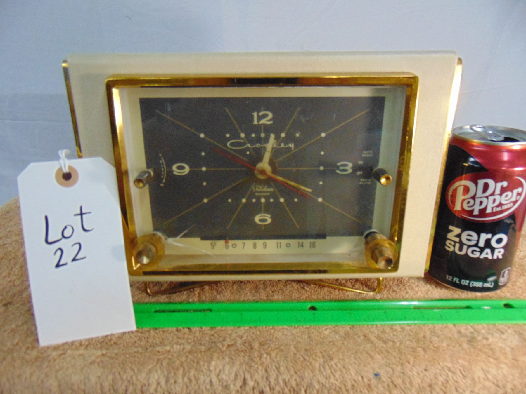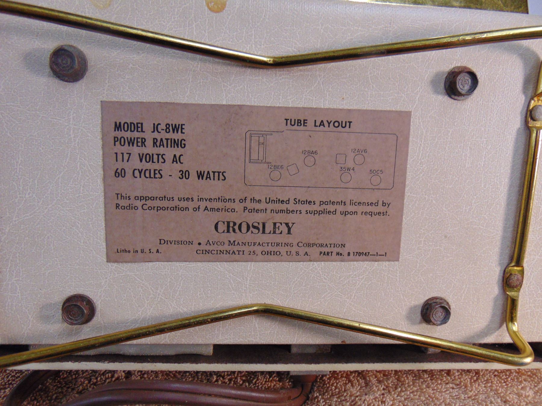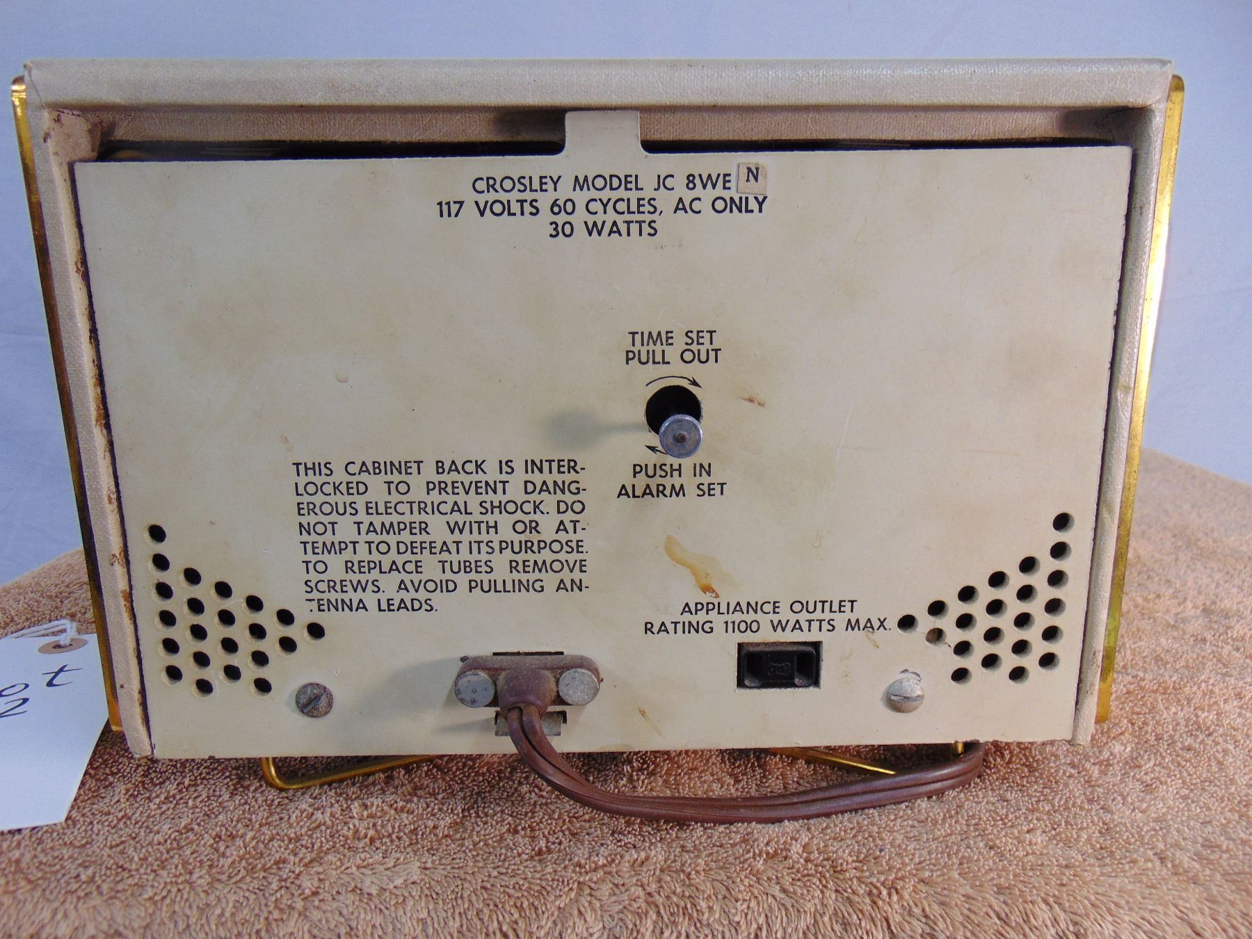 Crosley clock radio; synthetic leather covering; model JC-8WE; clock runs, radio not working; some hazing on dial glass; nice condition