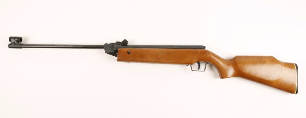 Spanish made break action single-shot air rifle chambered in .177 caliber, circa 1980"s. Features a 16.5" barrel, hooded front sight, adjustable rear sight, smooth trigger and a one piece pistol grip cheek rest stock with plastic buttplate. Blued finish shows scattered surface rust emerging all over. Condition is good. ***Antique Firearm***