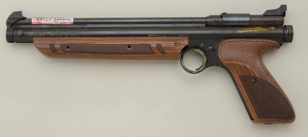 Crosman Model 1377 American Classic BB pump action pistol, .177 caliber with black finish and faux wood grips and pumping forend in factory box with instructions and BBs; gun is circa late 1970’s/early 1980s and in overall good condition with some surface grime and surface erosion spots that may clean with some TLC. Est.: $25-$50.