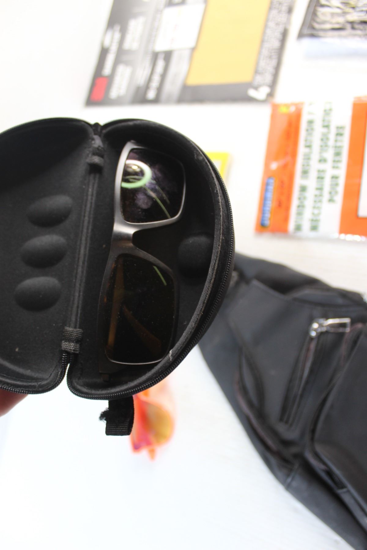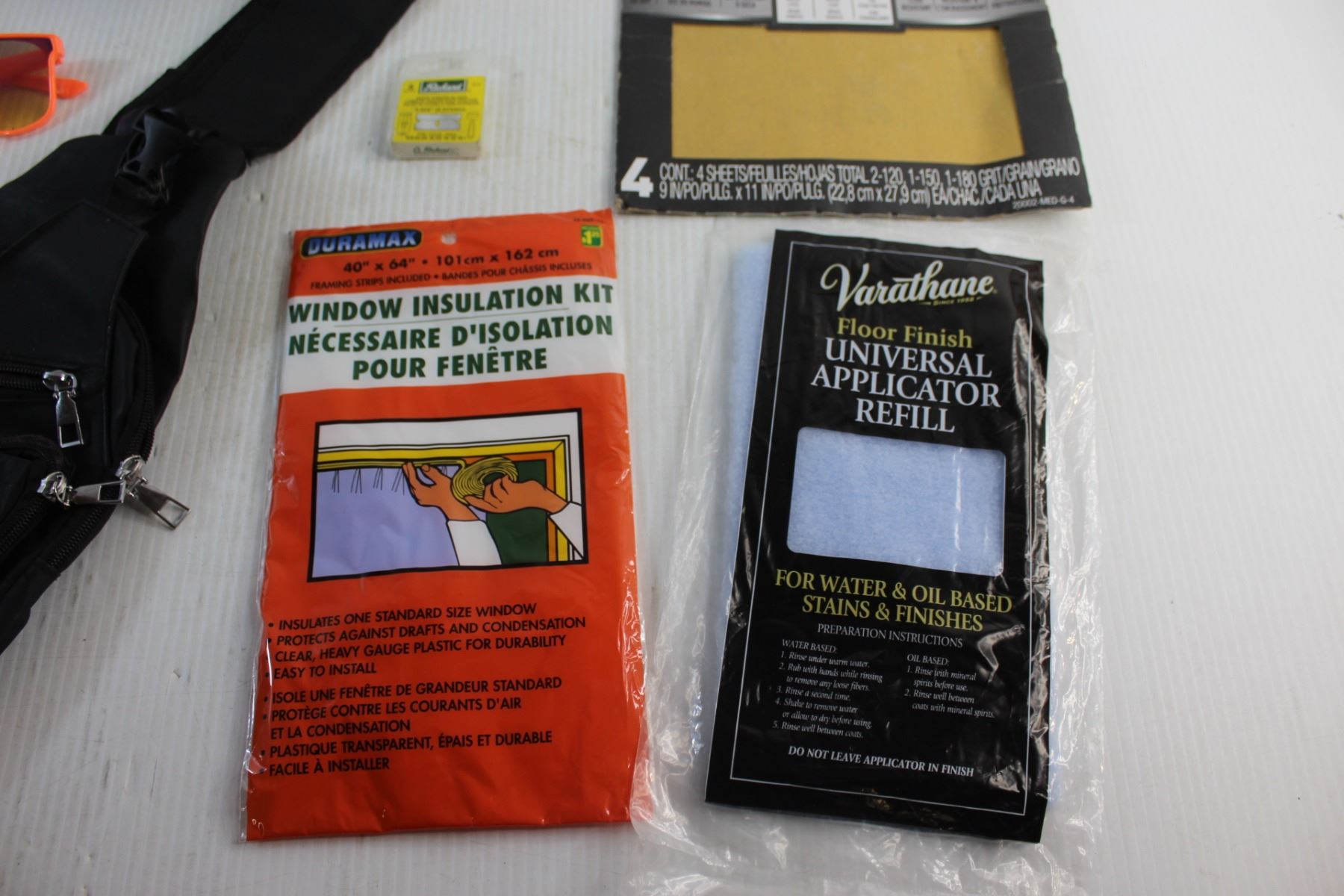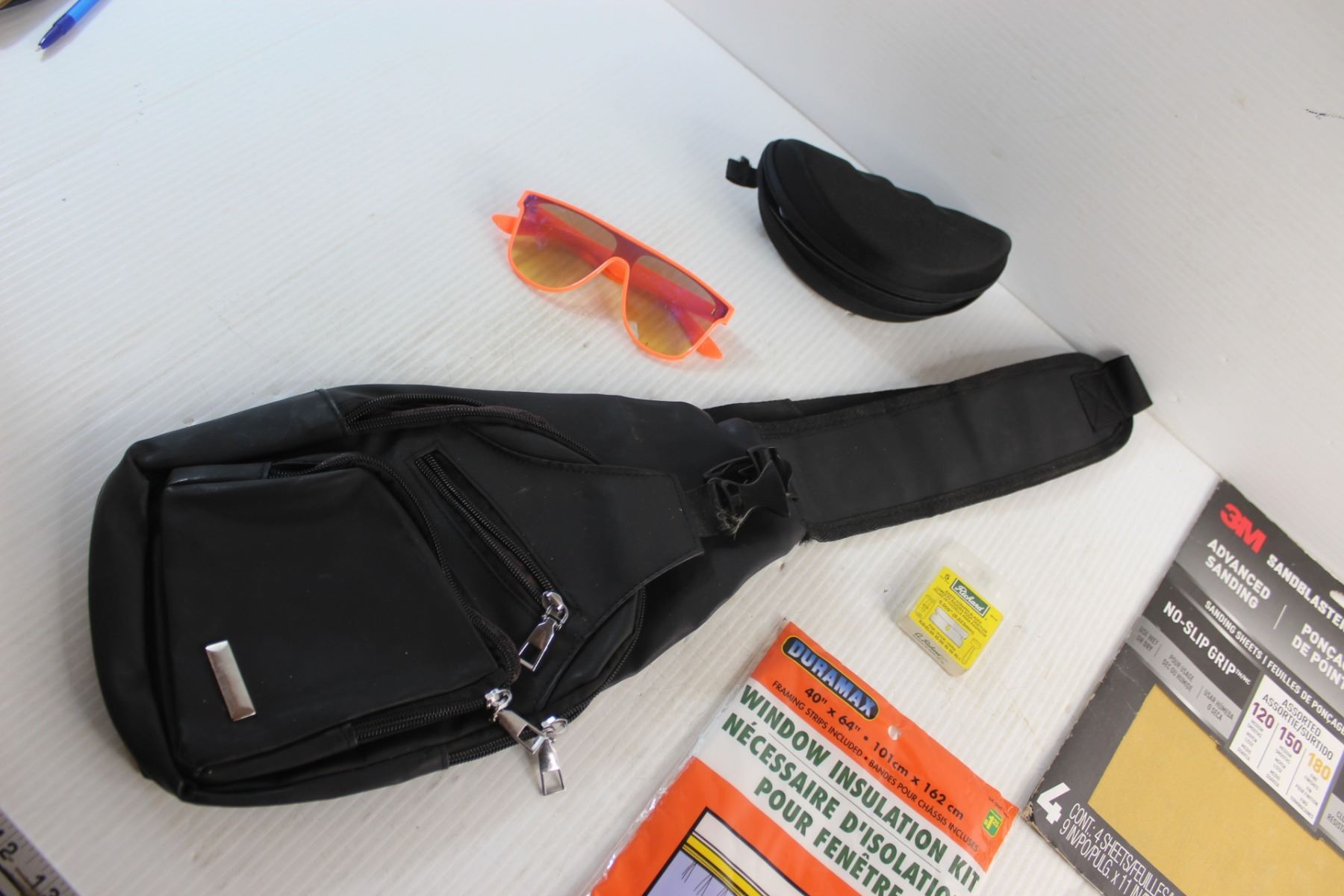 Cross Body Bag, Window Insulation Kit, 3M Sanding Sheets, Floor Finish and Sunglasses