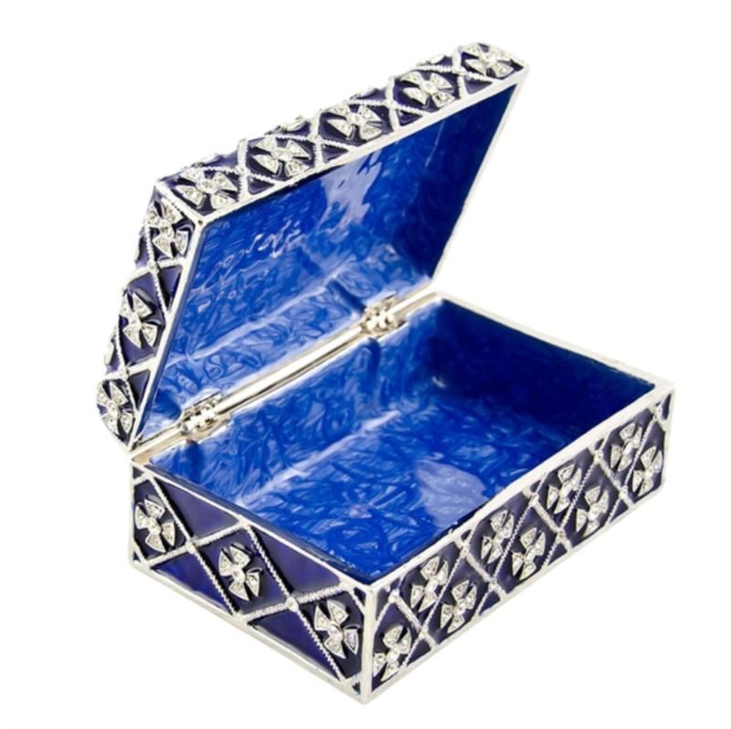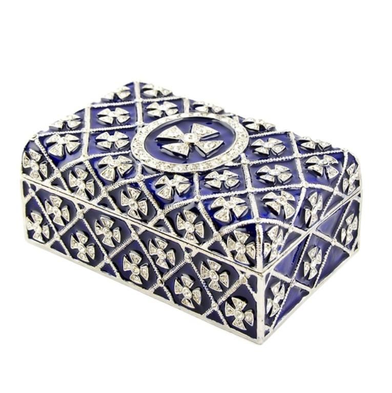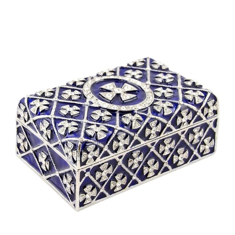 This box has blue translucent enamel under the crystal ornamentations in the form of crosses. Faberge?s superb enameling technique is regarded as one of his main contributions to art at the end of the last century. These wave (moir?) designs are a common type of guilloche work on enameled articles by Faberge. The inside of the box is covered with blue enamel. The royal glossy blue in the inside makes this box the perfect jewelry storage place! 3.75'' (L) X 2.25'' (W) X 1.5" (H) 15.5 oz Pewter, Crystals, Enamel