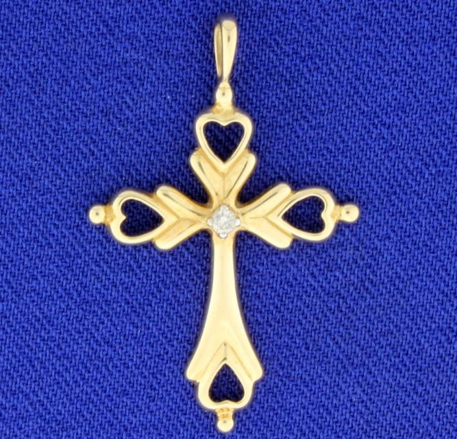 In 10K yellow gold, it has a .03ct round diamond in the center that has excellent color and clarity. The pendant is 1 1/4 inches long. 1.1g