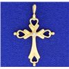 In 10K yellow gold, it has a .03ct round diamond in the center that has excellent color and clarity. The pendant is 1 1/4 inches long. 1.1g