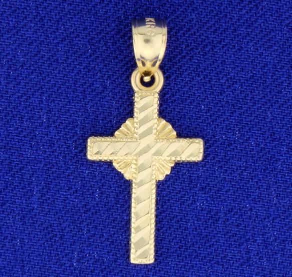 The pendant is 14K yellow gold and is 7/8 inch long. 1.0g