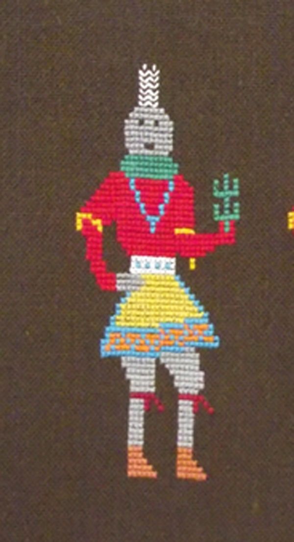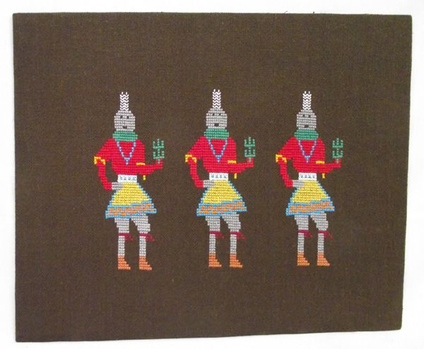 Cross Stitch Panel of 3 Native American Kachinas. Three Kachinas all alike on a dark brown cross stitch panel. The group of three measures approximately 8.5''Hx13''W while the entire panel measures 15.75''Hx19.75''W.