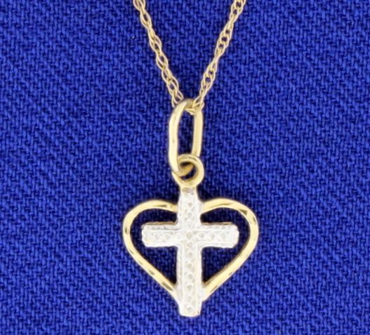 In 14K yellow and white gold, the chain is 19 inches long and the pendant is 5/8 inch long with bale. 1.0g