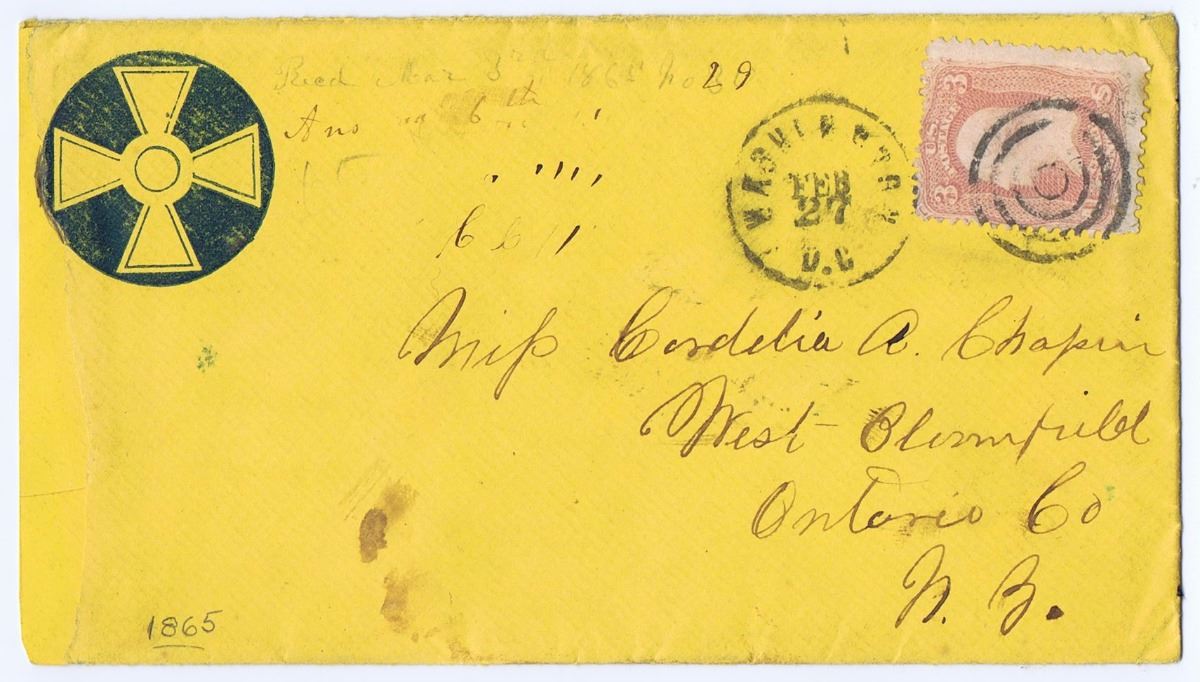 Intriguing midnight blue stylized Maltese cross, in solid circle, with hub, perhaps a printers' variant for 5th Corps, 1st Division, on yellow cover. Scott #65, a pale dull red not shown in McClung, 4-ring concentric, Washington, D.C. c.d.s., Feb. 27, "1865 No. 29" in period pencil at top. To "Miss Cordelia A. Chapin, West Bloomfield, Ontario Co., N.Y." Stamp with fast and high perfs into design at left and top, very wide margins at bottom and right. Some postal wear, two ink blots in blank area, clever old repair at left where irregular strip lacking at opening, with inlaid yellow sliver, exactly matching in shade and texture, edge of circle redrawn, else satisfactory.