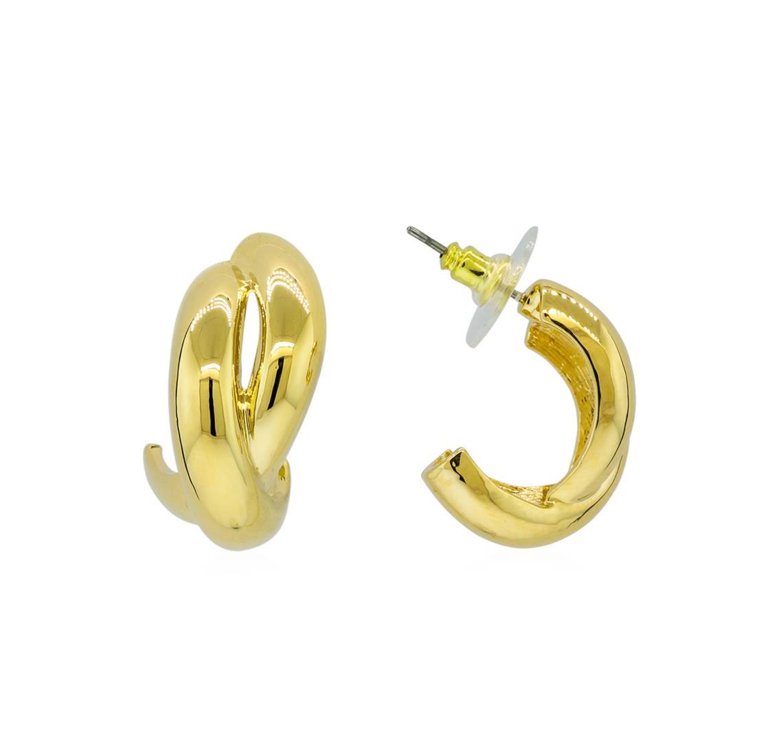 High end designer jewelry. Crossed Hoop Post Earrings - Gold Plated. Gold Plated Stud Set. Gold. 1inch.
