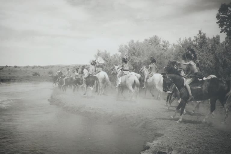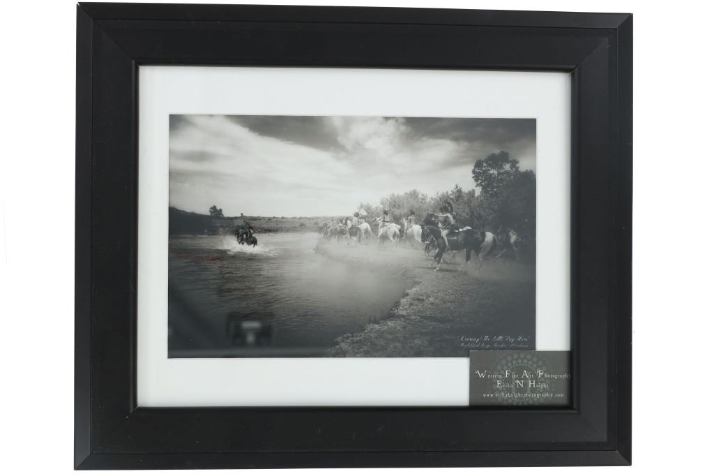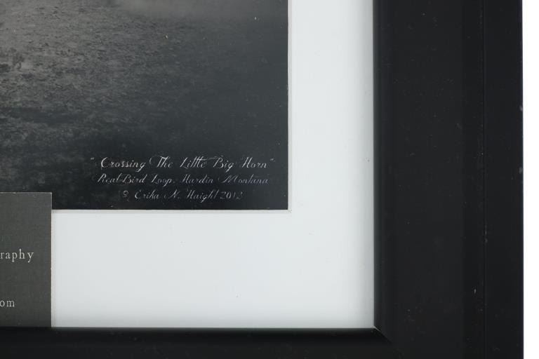 For your consideration is this original photo titled, "Crossing the Little Big Horn" taken by renowned Montana photographer Erika N. Haight at Real Bird Loop in Hardin, Montana circa 2012. Erika Haight of Roundup, Montana, has spent the last decade photographing and spending time with her adoptive Crow family, in addition to her other Western subjects. Her traditional black-and-white images document the Crow Nation's past customs and what remained in their absence. Haight has won various photographic competitions, and her work has appeared in a variety of magazines. This photo shows a group of Native American men and boys crossing a river on their horses. Many of them are shirtless and show hand painted images on their backs and their horses. The bottom right hand corner reads, "Crossing the Little Big Horn / Real Bird Loop. Hardin, Montana / © Erika N. Haight 2012" in white lettering. The photo is framed and matted once with white matting paper. The visible photo measures 7 1/2" L x 11 1/2" W, while the entire piece measures 14 1/4" L x 17 1/4" W x 7/8" D. It weighs 3 pounds and 4 ounces.