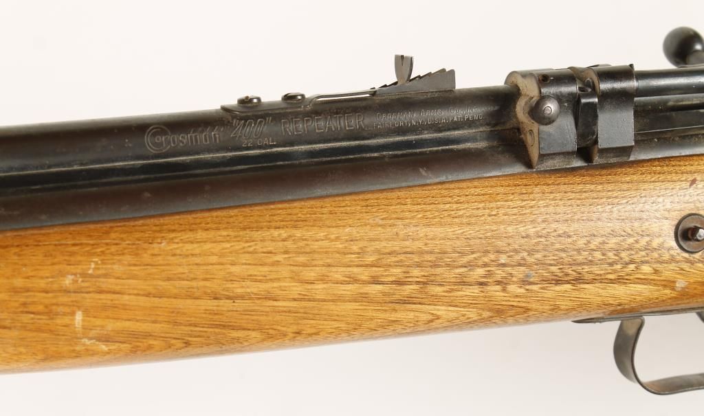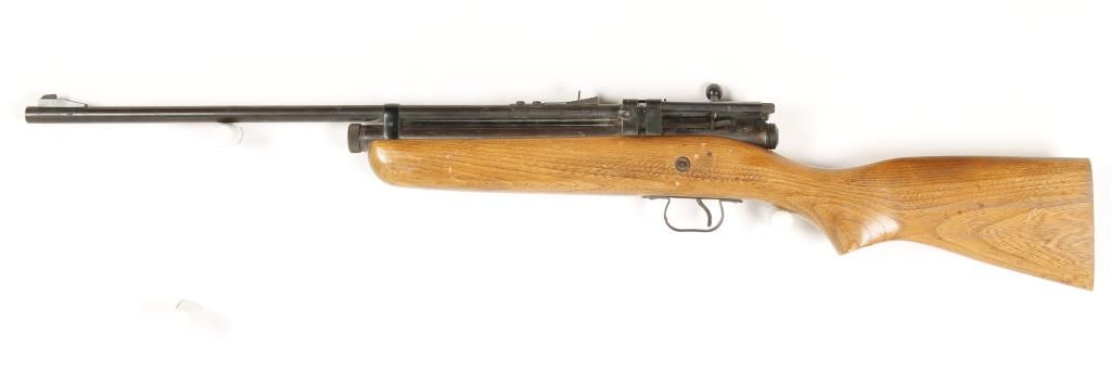 Vintage CO2 pellet gun made in late 1950's to early 1960's. Blued finish, plain pistol grip wood stock, open sights and cross bolt safety. Condition: Fair to good showing light pitting on metal.