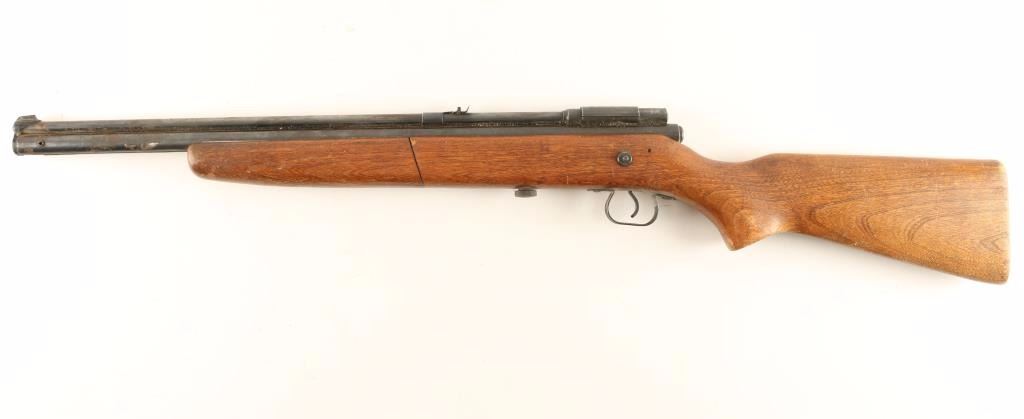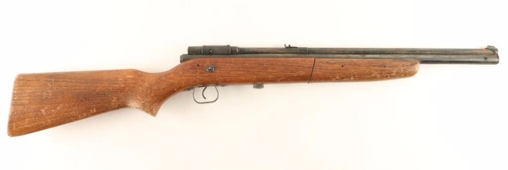 Has a wood stock and shoots a .22 cal. Scattered rust on barrel.