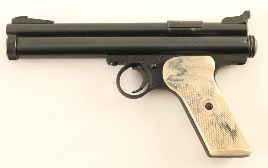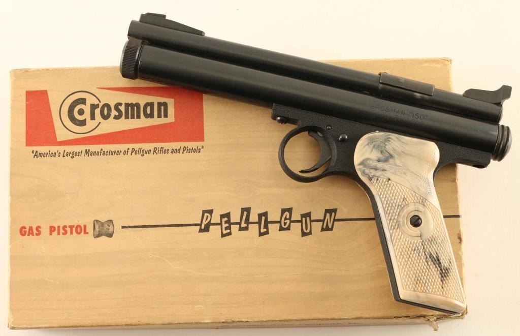 Co2 powered single shot pellet pistol chambered for .22 caliber ammunition, manufactured circa 1956, - 1967. Features a blued finish, 6" barrel, raised patridge front sight, windage adjustable rear sight, smooth trigger, serrated cocking knob, push button safety and two-piece checkered white marbled plastic grips. Includes a factory two-piece cardboard box with Co2 cartridges, cleaning brush & documents. Pistol exhibits the majority of it's blued finish showing very little wear. Action is sound, the bore is bright and the plastic grips are fine. Condition is Excellent in box.