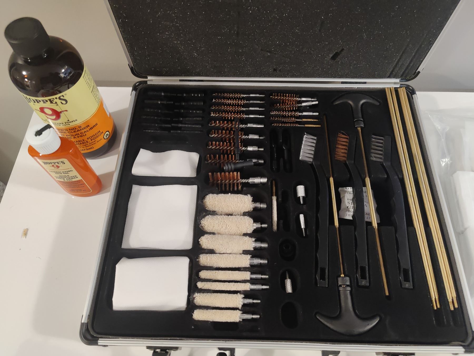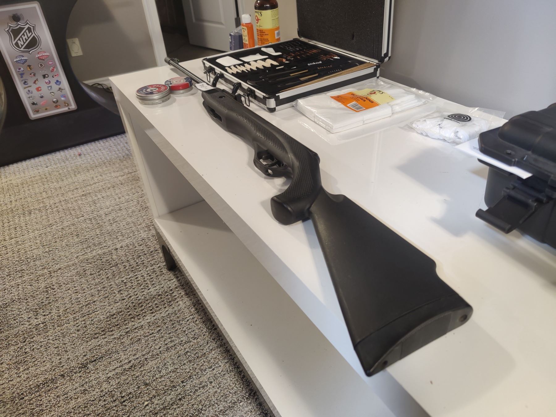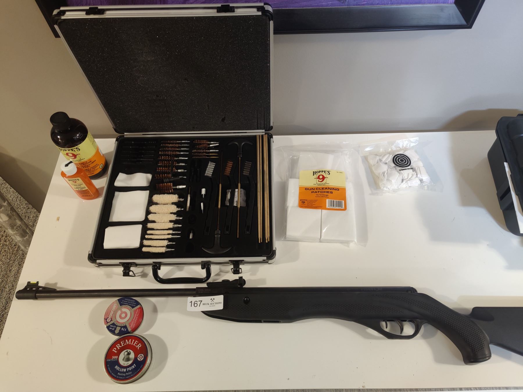 Comes with Gun cleaning kit, pellets, cleaning solution, lubricant, and gun cleaning patches.