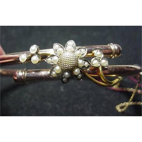 Charming Victorian crossover hollow 14kt yellow gold hinged bangle asscented with a floral spray - dairy (pearl set petals) along with 2 pearl trefoils as accents. Very Good Condition. No dents. Call or email for a condition report. We accept visa/mc.