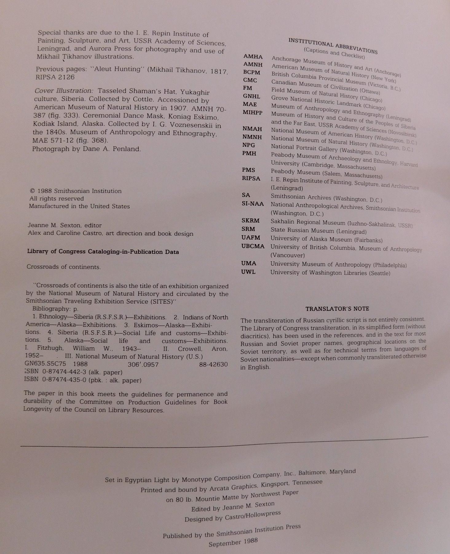 Crossroads of Continents Book, 1988. Made of paper and ink, the item measures 9" x 11.25" x 1". Maryland, USA. Fitzhugh & Crowell are the authors of this book covering cultures of Siberia and Alaska. Great reference book. Condition: Pre-owned, good, see images. Shipping: $16.50 w/insurance and signature.