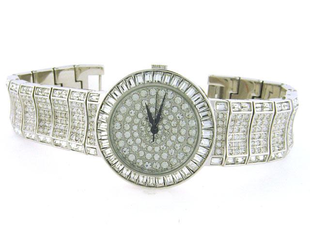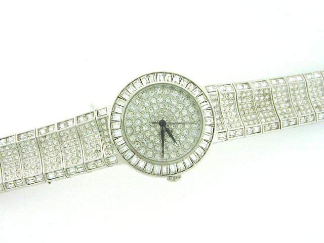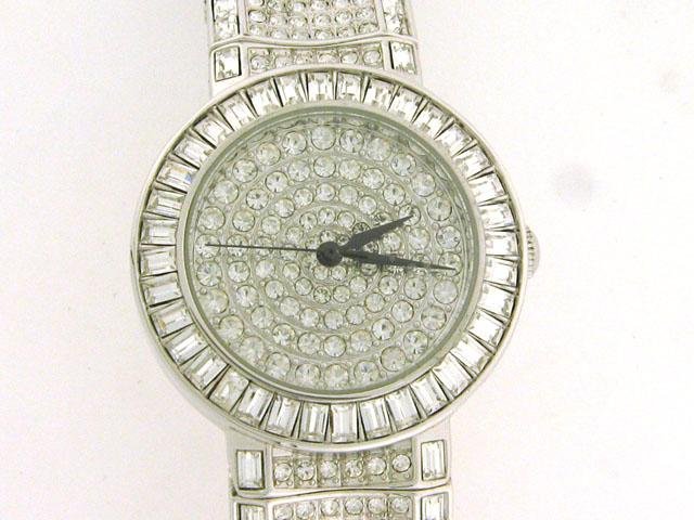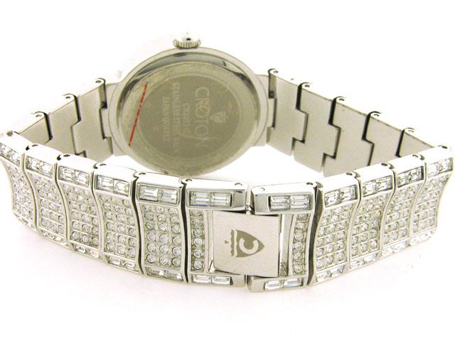 This is a Croton Balliamo Pave Crystal Quartz Bracelet Watch with the following features: Silvertone bracelet; Japanese Miyota Quartz; Mineral Crystal; Push/pull crown; Push Button dual deployant clasp; case measures: 32 mm; and Stainless steel back.