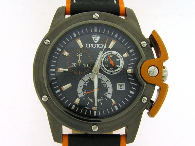 Aluminum and stainless steel case, Genuine black and orange leather strap, Fixed bezel with screws, Black dial with orange accents, 3 chronograph sub-dials, Date display, Sapphire crystal, Buckle clasp, 43 mm case diameter, Water resistant at 50 meters