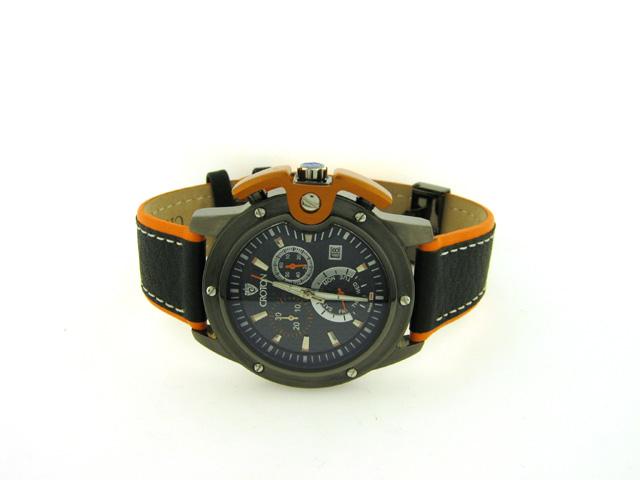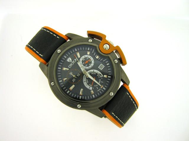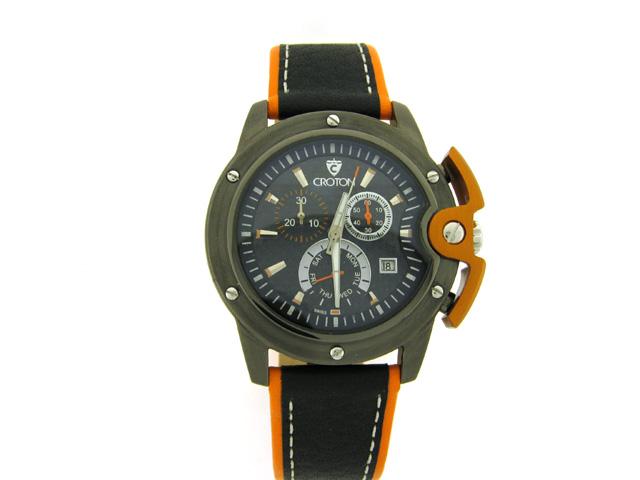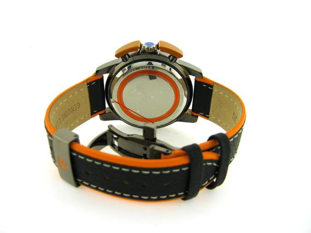 Aluminum and stainless steel case, Genuine black and orange leather strap, Fixed bezel with screws, Black dial with orange accents, 3 chronograph sub-dials, Date display, Sapphire crystal, Buckle clasp, 43 mm case diameter, Water resistant at 50 meters