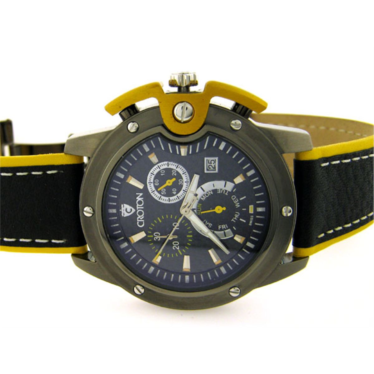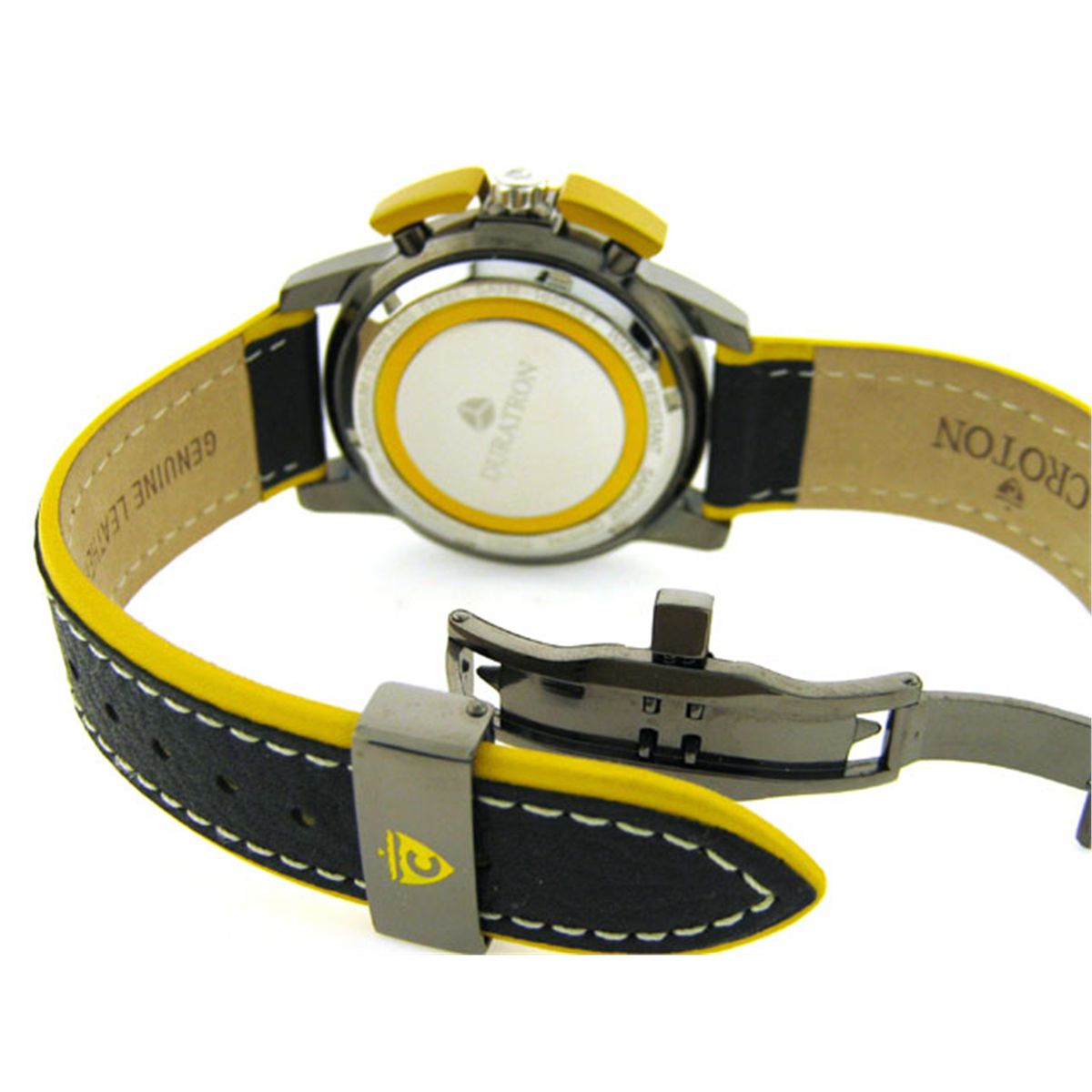 Aluminum and stainless steel case, Genuine black and yellow leather strap, Fixed bezel with screws, Black dial with yellow accents, 3 chronograph sub-dials, Date display, Sapphire crystal, Buckle clasp, 43 mm case diameter, Water resistant at 50 meters