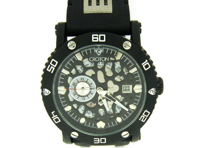 This is Croton Men's Automatic Stainless Steel Rubber Strap Watch in a Black strap, stylish, and sport-infused design The watch has a round stainless steel black case. It also features a case-coordinating, unidirectional rotating bezel with seconds scale. A convenient Japanese automatic movement exists at the core of the watch. The round dial, in strap matching color, displays the Croton logo at 12:00 and silver-tone index markers at all remaining hour positions. A date window appears next to 3:00 while a 24-hour sub-dial shows up near 9:00. An open heart cut-out allows you to see the movement beneath the dial. The Silver-tone luminous hour and minute hands and a red-tipped silver-tone seconds hand deliver the time. A comfortable and sporty rubber strap with silver-tone stainless steel inserts provides a secure fit and locks in a push button dual deployant clasp. The watch movement is a Japanese 8217 automatic with Crystal and a Mineral Crown of Push/pull. The Clasp is a Push button dual deployant. The Strap Measurements is 10" long x 24 mm wide and Case Measurement is 44 mm. The watch is Water Resistance: 5 ATM - 50 meters - 165 feet.