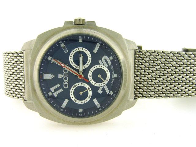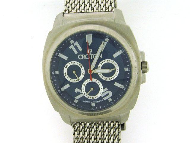 This is a Croton Men's Quartz Multifunction Stainless Steel Mesh Bracelet Watch with the following features: blue round dial; rounded square silver-tone stainless steel case; round bezel; mineral crystal; stainless steel back; coin edge push and pull crown; luminous accented index markers; Arabic numerals at 1:00, 5:00, 7:00 and 11:00; A Japanese Miyota 6P29 Quartz movement; luminous filled silver-tone hour and minute hands; and red seconds hand; day, date, and 24 hour subdials with silver-tone hands; push button dual deployant clasp; silver-tone stainless steel mesh bracelet; Bracelet Measures 8-1/2 L x 22mm W; Case Measures 51mm L x 46mm W; and Water Resistant.