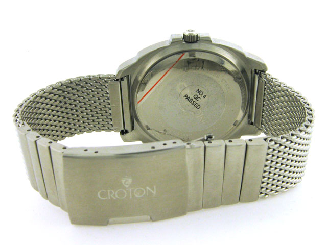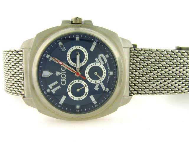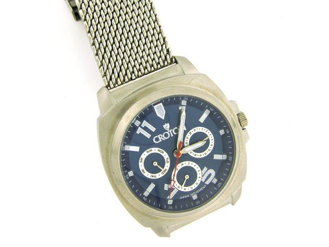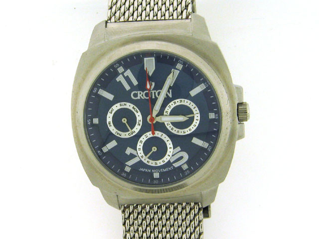 This is a Croton Men's Quartz Multifunction Stainless Steel Mesh Bracelet Watch with the following features: blue round dial; rounded square silver-tone stainless steel case; round bezel; mineral crystal; stainless steel back; coin edge push and pull crow