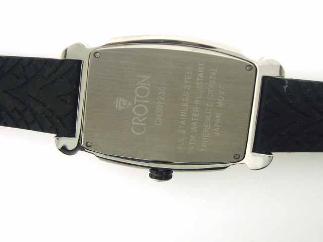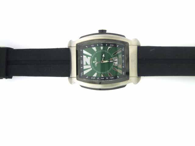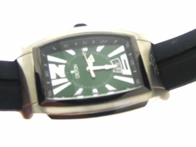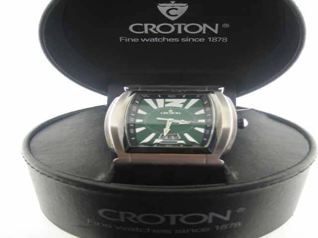 This is Croton Men's Quartz Tonneau Case Rubber Strap Watch (CN307235BSBL Green). The watch has a Green Modern style, precision technology and quality craftsmanship. The watch case is in silver-tone stainless steel with a Croton logo-engraved bezel and a push and pull crown. It also has a Sphereulite crystal which protects the tonneau dial. The Silver-tone index markers appear at all hour positions except 12:00 and 6:00 where Arabic numerals display. A Miyota 2305 Quartz movement compels the luminous silver-tone hour and minute hands and red-tipped silver-tone seconds hand. A date window shows above 6:00 and the Croton name appears below 12:00. The watch has a black rubber strap which attaches with a silver-tone buckle clasp. The Strap Measurements is 10" long x 23 mm wide and the Case Measurements is 41mm long x 44mm wide. The watch is Water Resistance: 3 ATM - 30 meters - 100 feet.