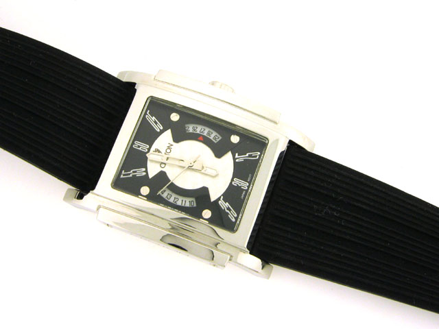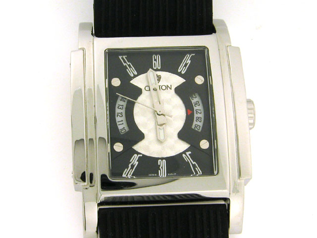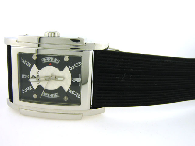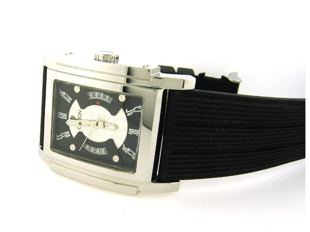 This is a Croton Watch with Rubber Band Watch (CN307154). The watch has the following features: All stainless steel; Rubber band with buckle clasp engraved with Croton name; Croton engraved on the side of the bezel; Japan quartz movement; and Water resistant