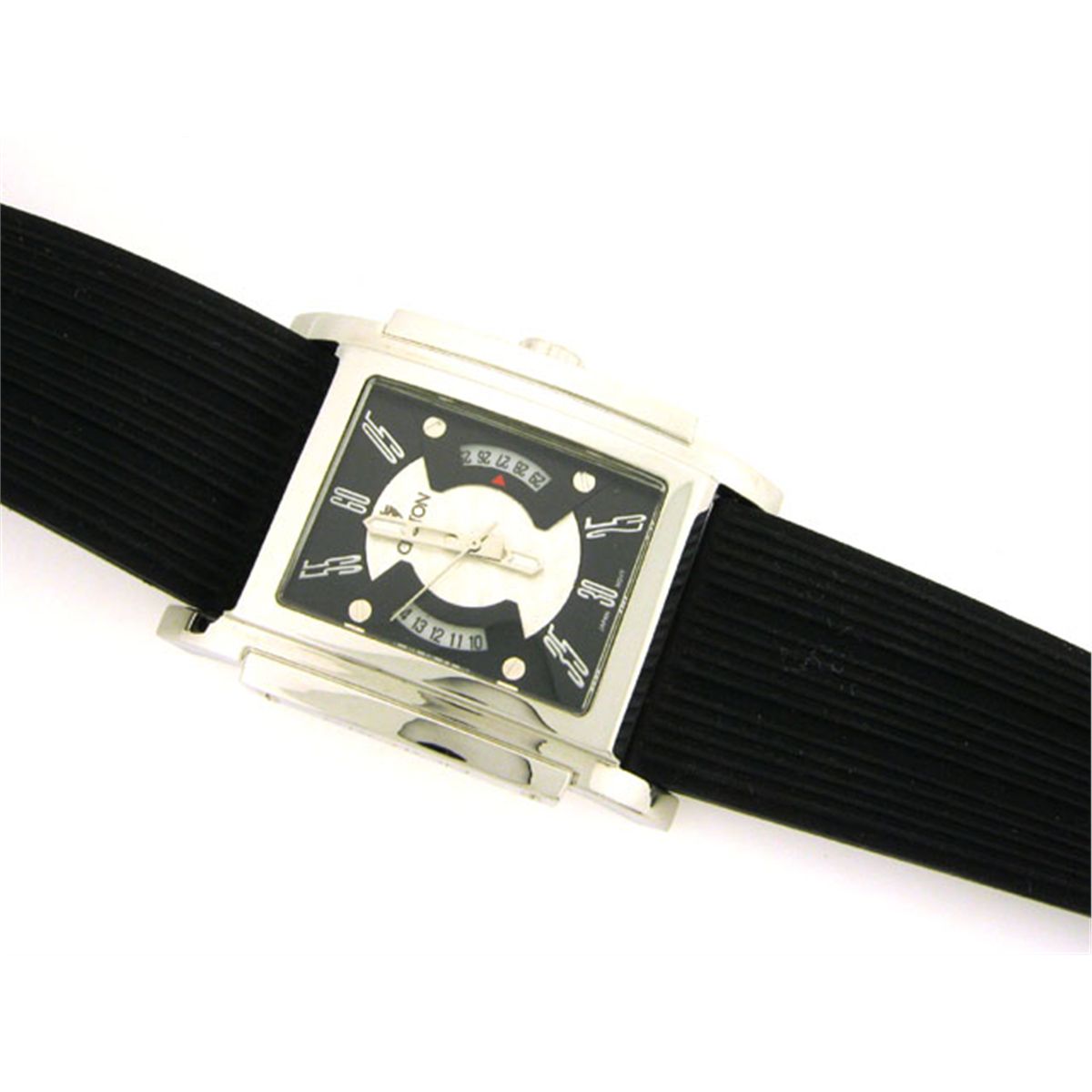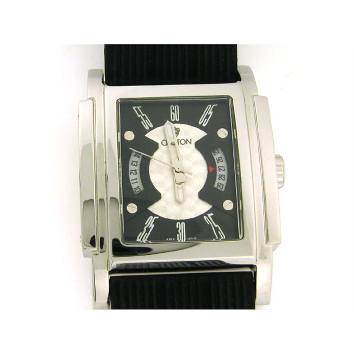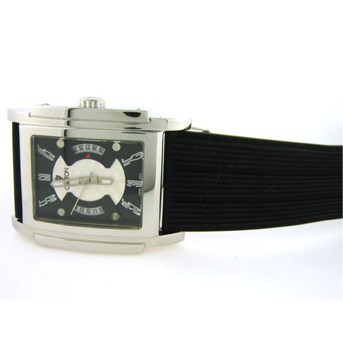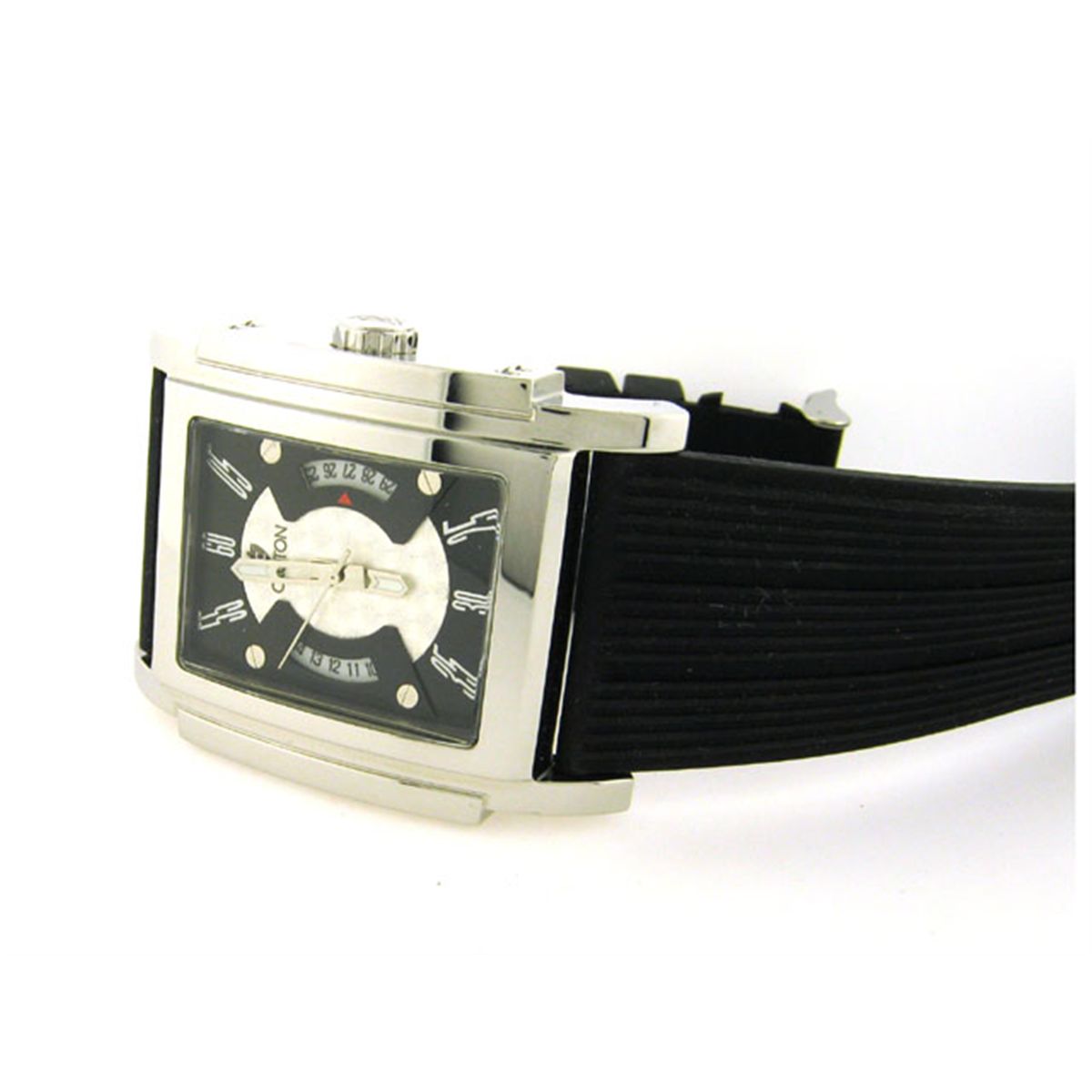 This is a Croton Watch with Rubber Band Watch (CN307154). The watch has the following features: All stainless steel; Rubber band with buckle clasp engraved with Croton name; Croton engraved on the side of the bezel; Japan quartz movement; and Water resistant
