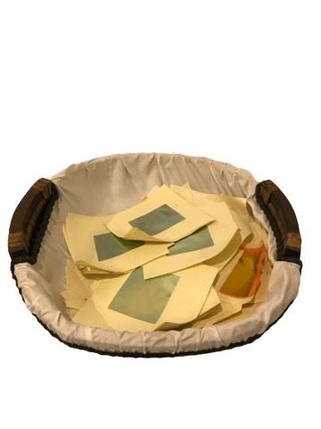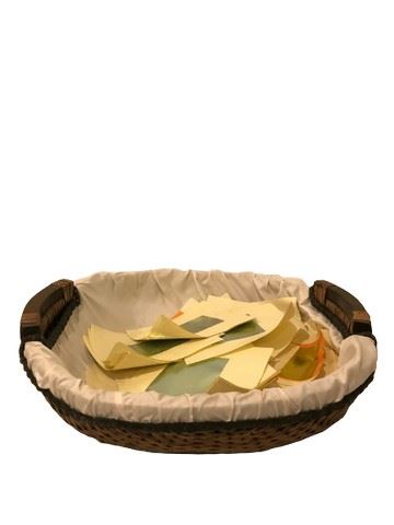 Two cloth lined, wicker baskets with joss paper tossed inside. (16"x16"x4", 14"x16"x5")