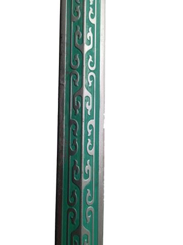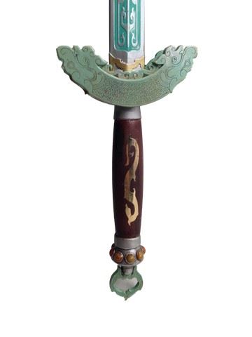 Screen used "Green Destiny" sword. Sword is a silver resin blade with green design. The handle is green resin dragon body with two dragon heads, brown resin grip and gold design with a green decorative tip at the bottom of the handle. This is the main sword in the film. (40x5) After eighteen years of solitude, renowned warrior-maiden Shu Lien emerges from retirement and travels to Peking, where the Green Destiny—the legendary sword of her deceased love Li Mu Bai—is located. This is the legendary sword that the film is based upon - do not miss this opportunity to own it!! Replicas of this sword cannot be compared!